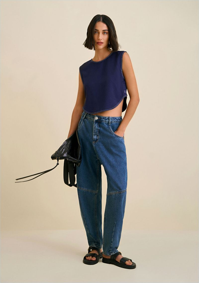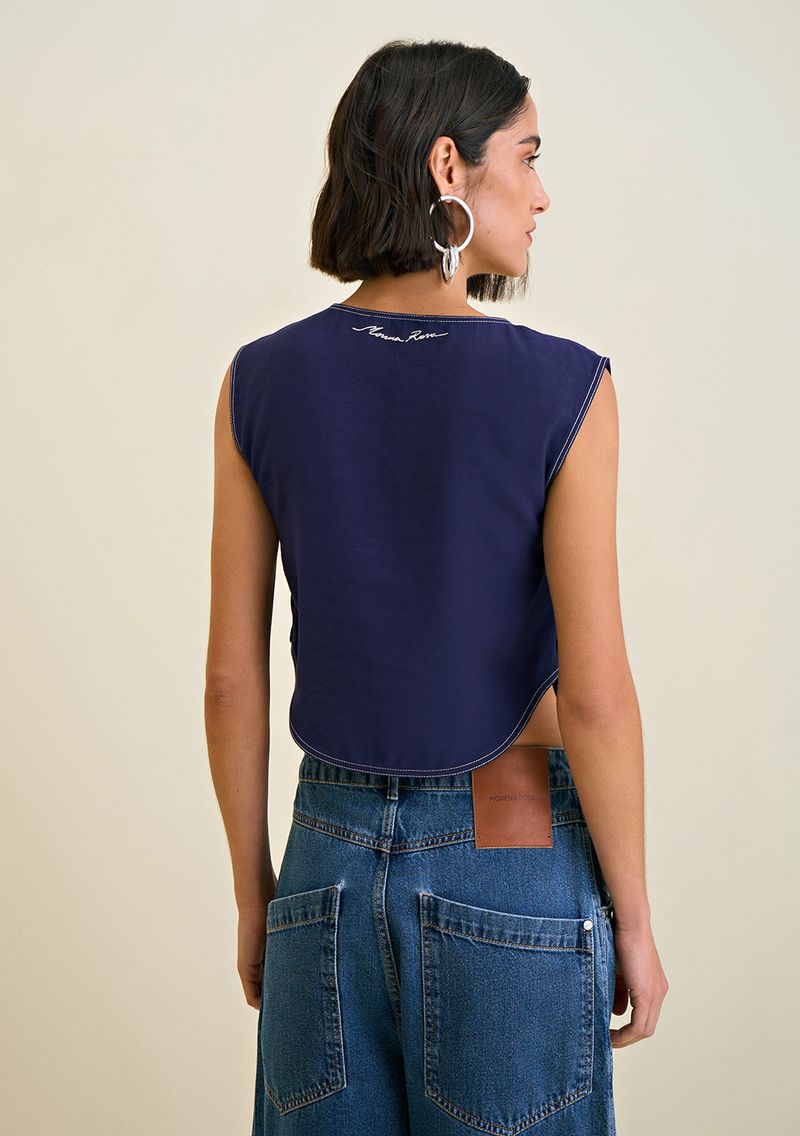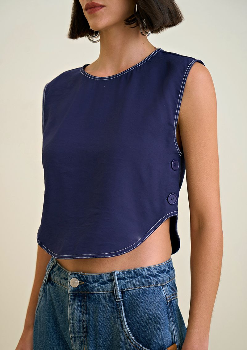 Blusa Morena Rosa Decote Redondo Sem Manga Com Botão Azul Marinho