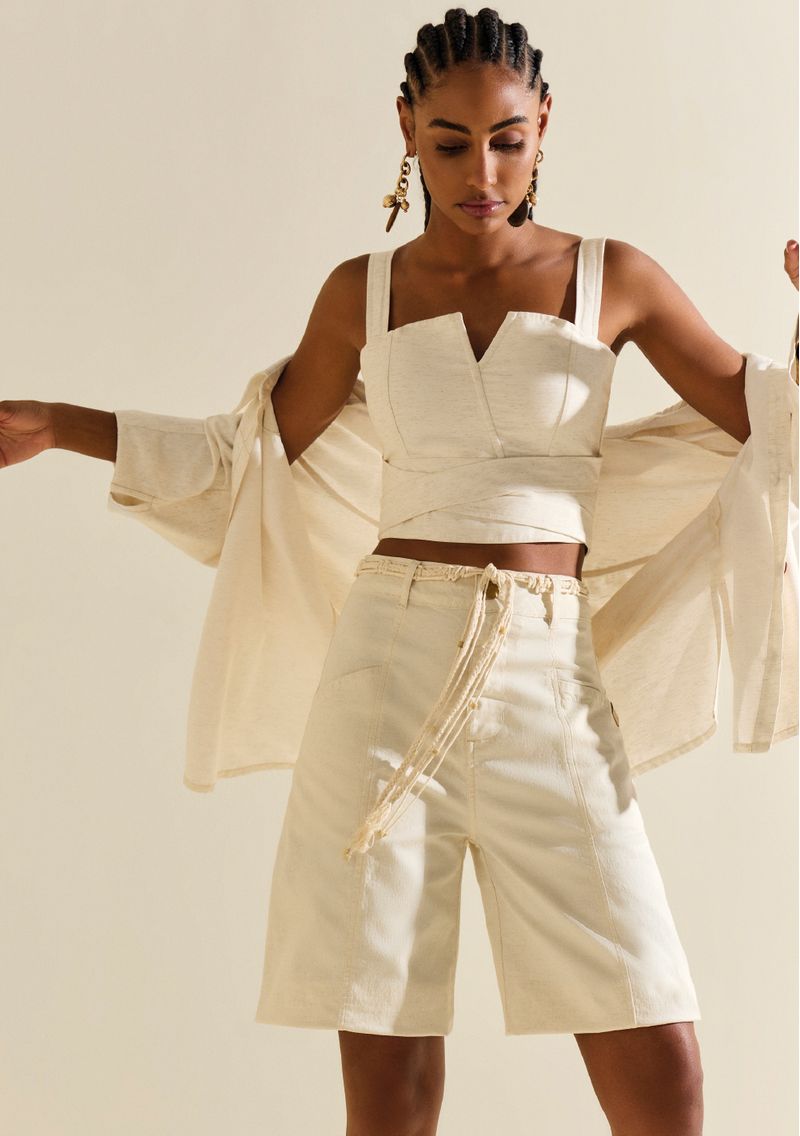 Experimente a sofisticação e leveza da Bermuda Morena Rosa Reta Alta Bege. Com uma modelagem reta de cintura alta, esta peça em sarja traz uma combinação de algodão, viscose, linho e elastano, garantindo conforto e um caimento impecável. Ideal para eventos sofisticados ou para um look casual-chic, sua cor bege é versátil, permitindo combinações com blusas vibrantes ou neutras. Complete o visual com sandálias de salto e acessórios dourados para uma presença marcante. Parte da Coleção Recife, ela captura o espírito vibrante e tropical do verão brasileiro. Acessórios não acompanham as peças.