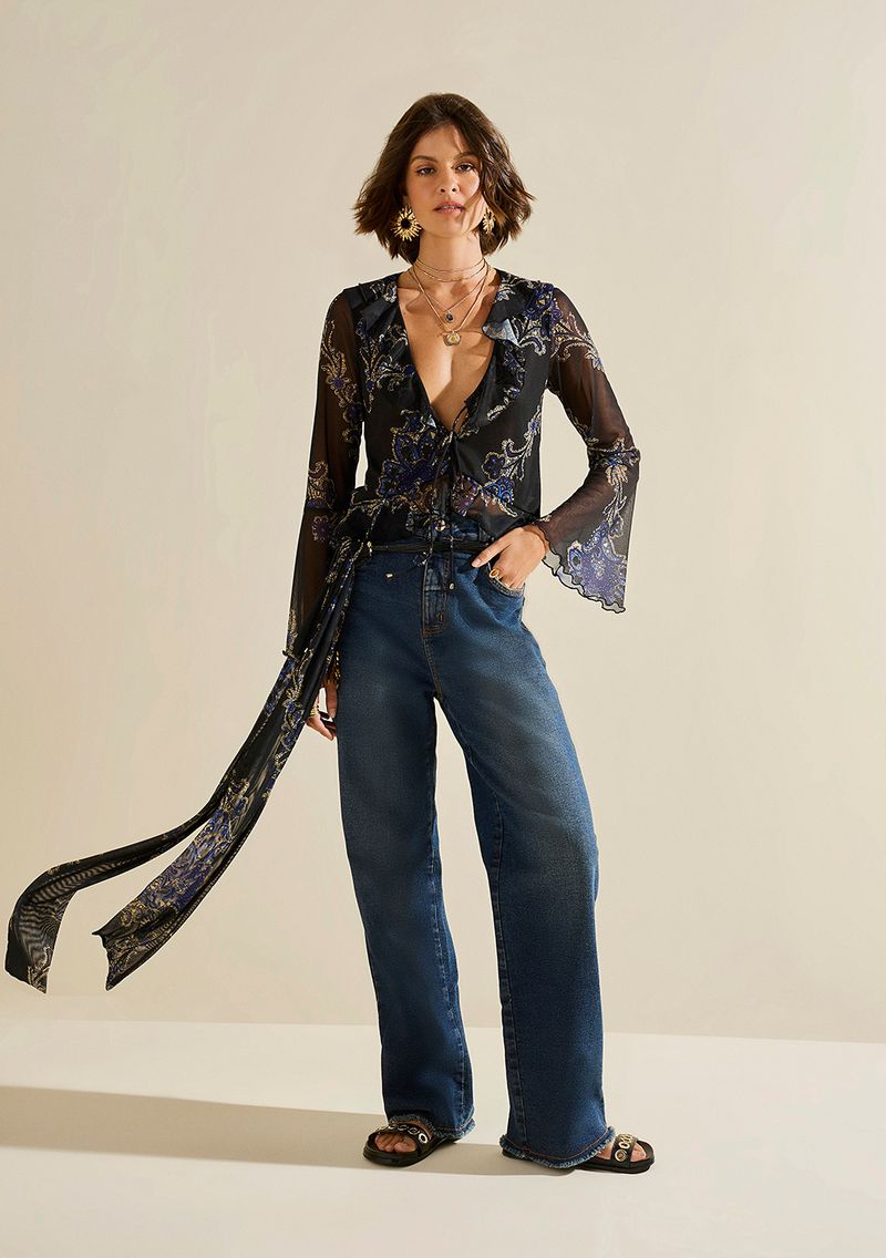 Blusa Morena Rosa Ajustada Decote V Manga Longa Padrão Preto