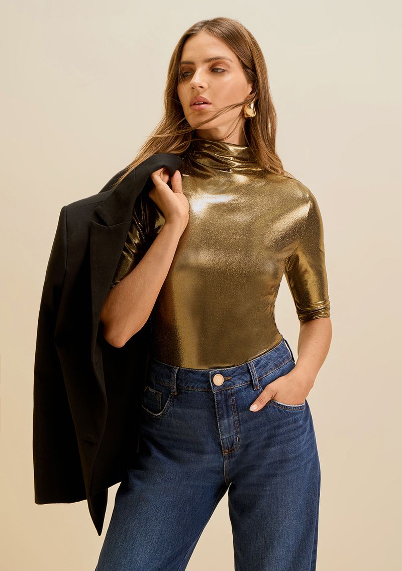 LinhasColeçõesRoupasBlusasBlusasBlusa Morena Rosa Ajustada Gola Alta Manga Curta Padrão Dourado