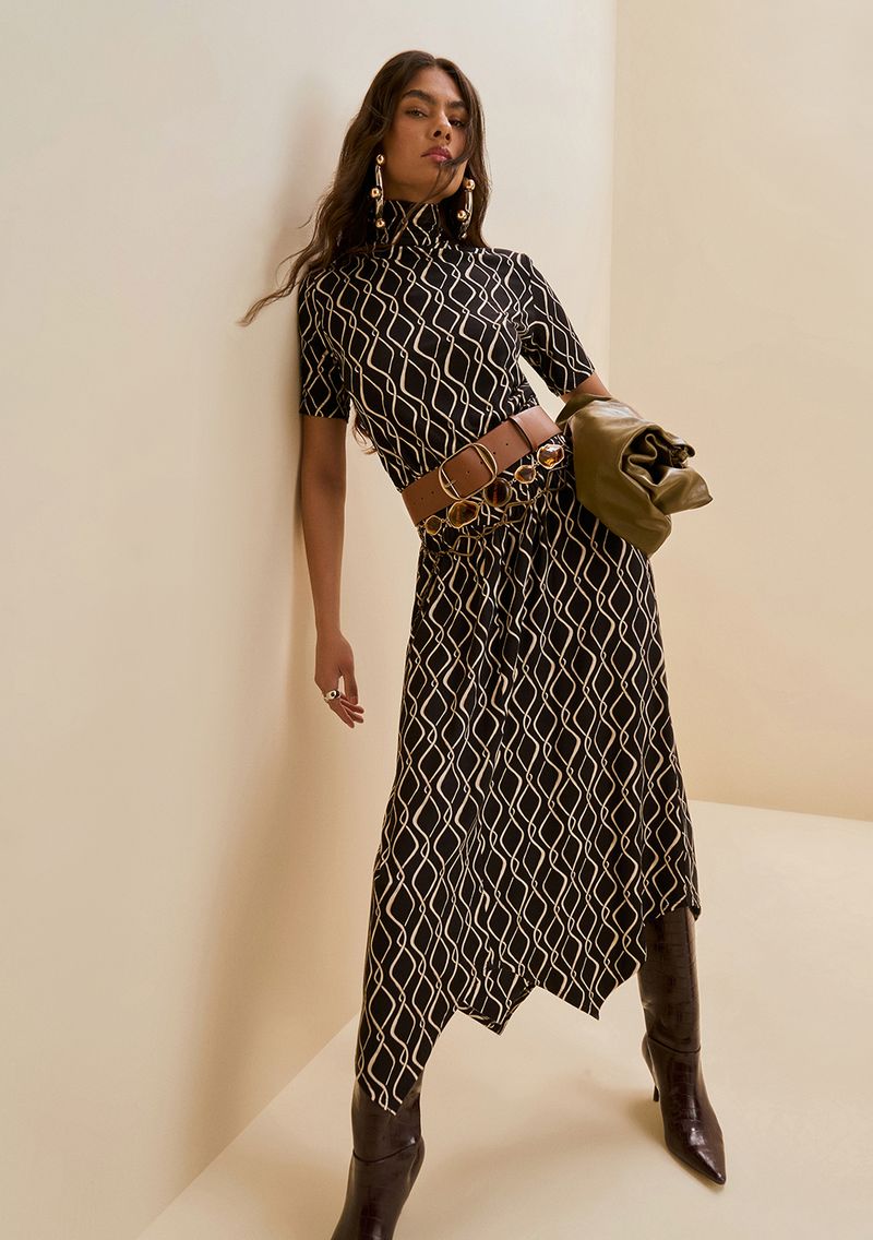 A Blusa Morena Rosa Ajustada Gola Alta Manga Curta Padrão Preto é a definição de sofisticação e versatilidade. Com um design ajustado que valoriza suas curvas, essa peça é confeccionada em tecido de alta qualidade, garantindo conforto e elegância. A gola alta e as mangas curtas trazem um toque moderno e refinado, ideal para transitar entre o trabalho e eventos sociais. Combine-a com saias midi ou calças de alfaiataria para um look chic, ou aposte em jeans para um visual descontraído. Parte da coleção inspirada em estampas étnicas e cultura boêmia, esta blusa celebra o charme brasileiro. Descubra o poder de se sentir confiante e inesquecível com Morena Rosa.