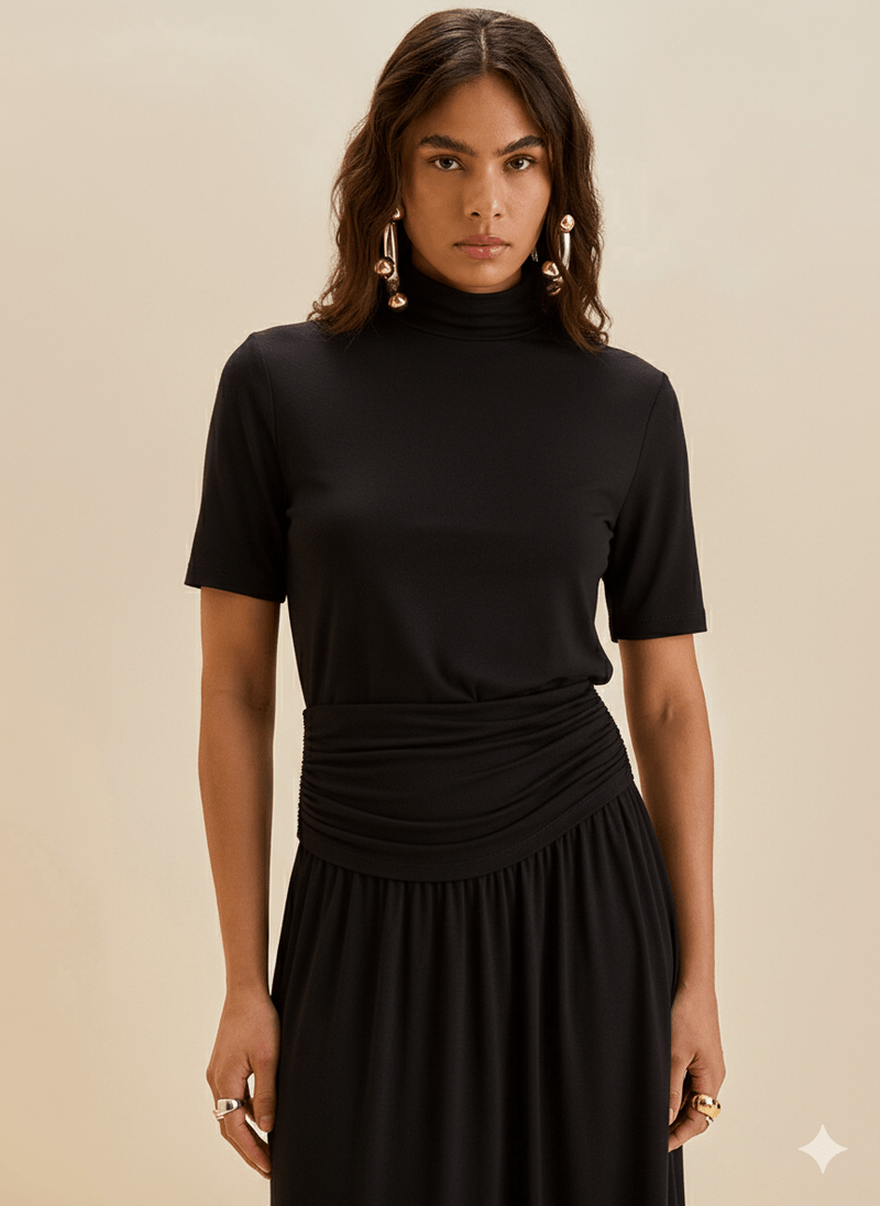 A Blusa Morena Rosa Ajustada Gola Alta Manga Curta Padrão Preto é a definição de sofisticação e versatilidade. Com um design ajustado que valoriza suas curvas, essa peça é confeccionada em tecido de alta qualidade, garantindo conforto e elegância. A gola alta e as mangas curtas trazem um toque moderno e refinado, ideal para transitar entre o trabalho e eventos sociais. Combine-a com saias midi ou calças de alfaiataria para um look chic, ou aposte em jeans para um visual descontraído. Parte da coleção inspirada em estampas étnicas e cultura boêmia, esta blusa celebra o charme brasileiro. Descubra o poder de se sentir confiante e inesquecível com Morena Rosa.