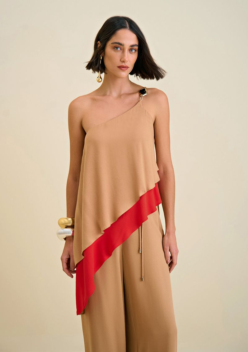 Blusa Morena Rosa Decote Assimétrico Alça Bicolor Bege