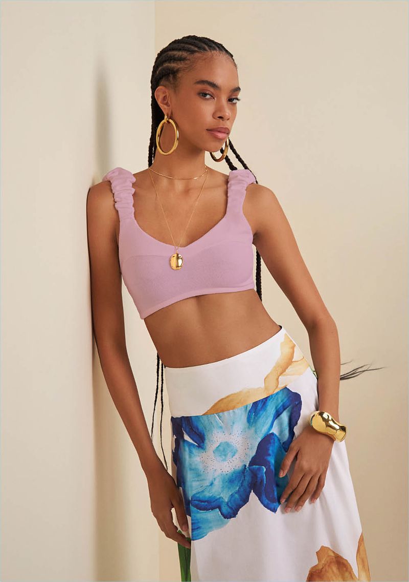 OUTLETLinhasColeçõesRoupasBlusasBlusasBlusa Morena Rosa Decote Redondo Alça Tricot Lilas