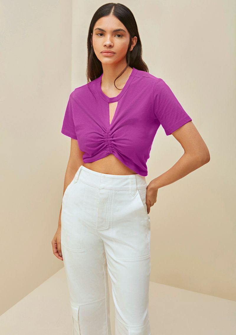 OUTLETLinhasColeçõesRoupasBlusasBlusasBlusa Morena Rosa Decote Redondo Manga Curta Com Amarração Rosa