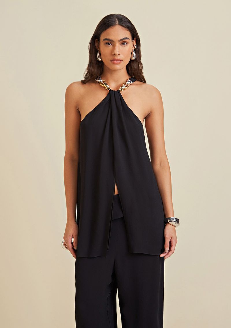 OUTLETLinhasColeçõesRoupasBlusasBlusasBlusa Morena Rosa Decote Redondo Sem Manga Detalhe Decote Preto