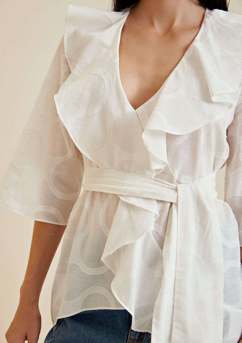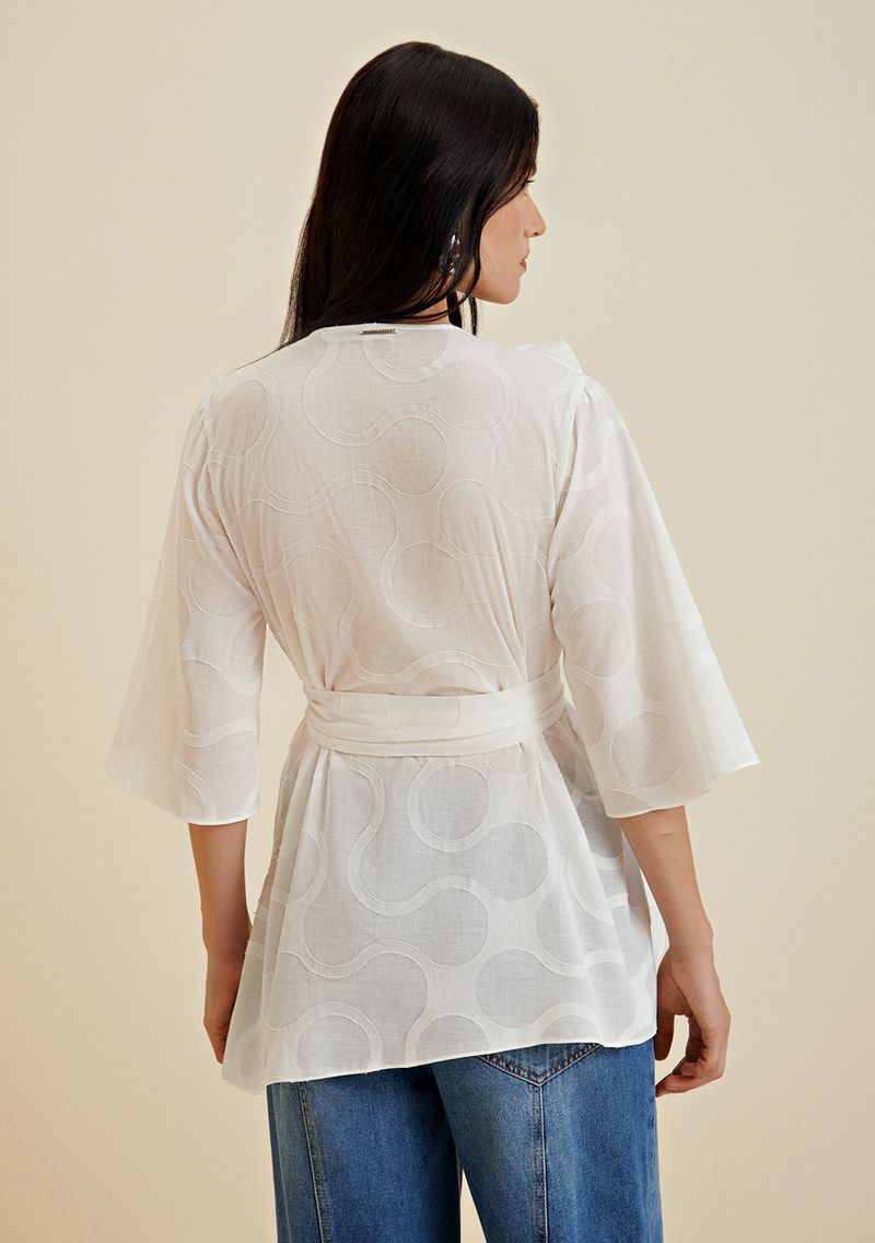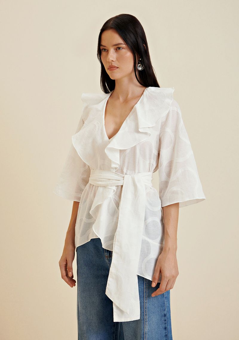 OUTLETLinhasColeçõesRoupasBlusasBlusasBlusa Morena Rosa Decote V Manga Curta Com Babado Off White