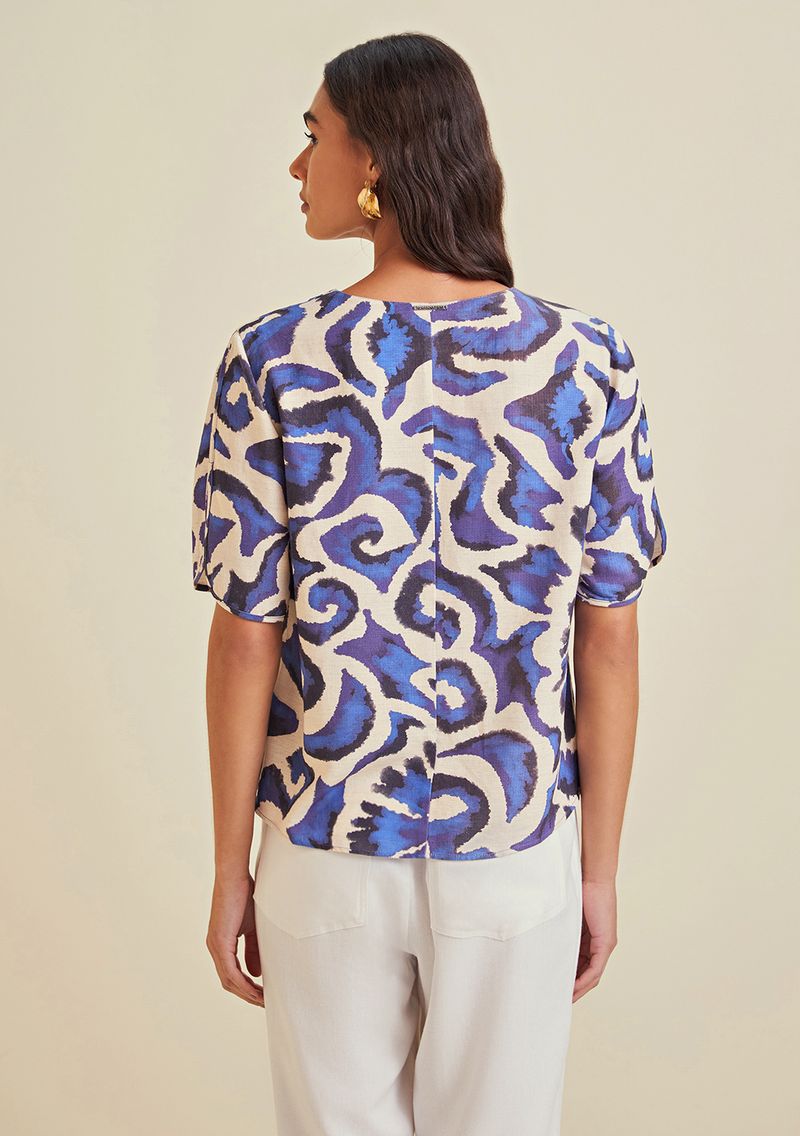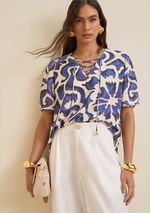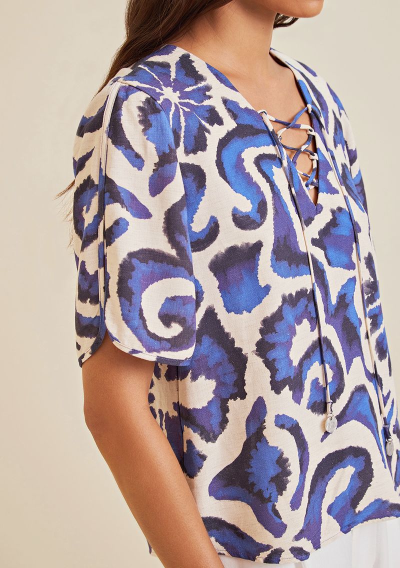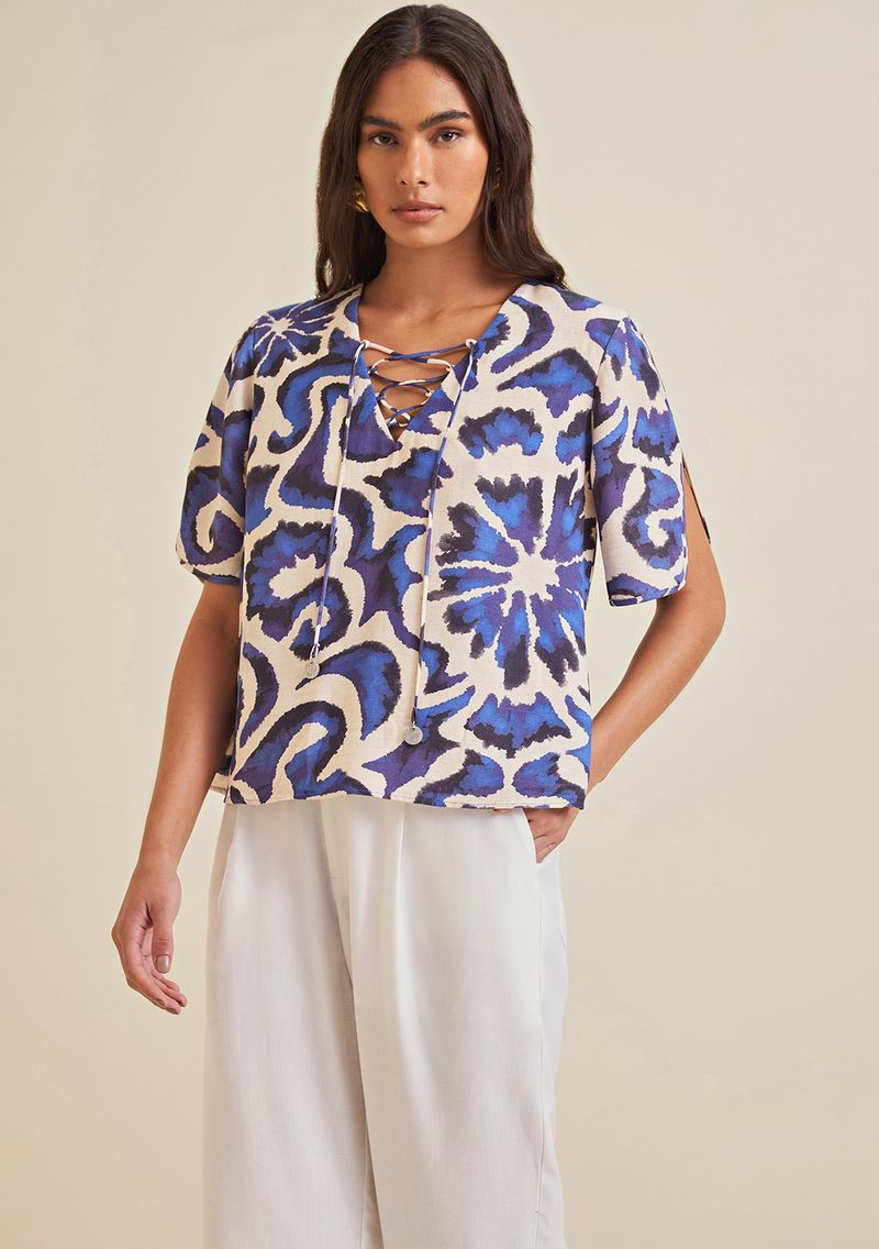 OUTLETLinhasColeçõesRoupasBlusasBlusasBlusa Morena Rosa Decote V Manga Curta Detalhe Frente Azul