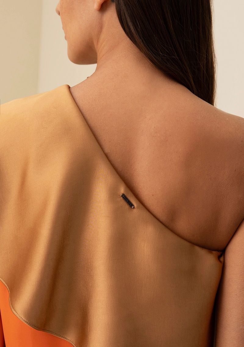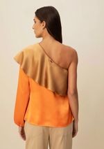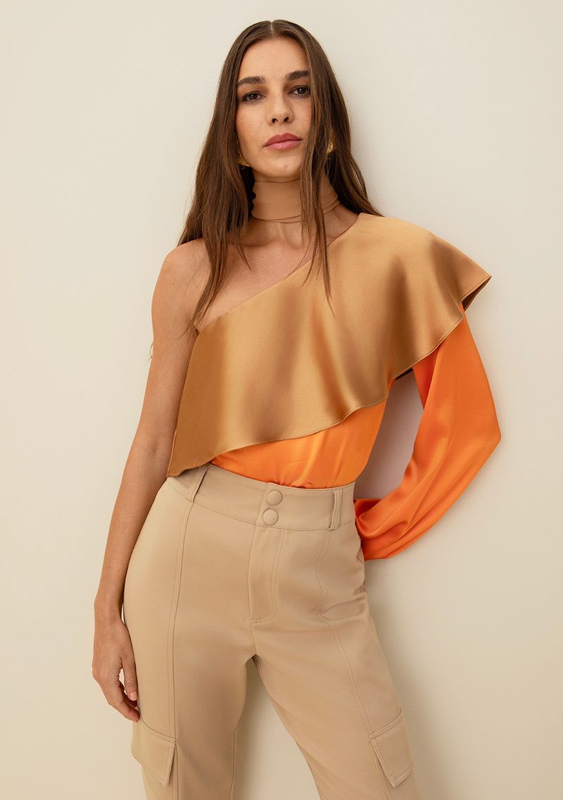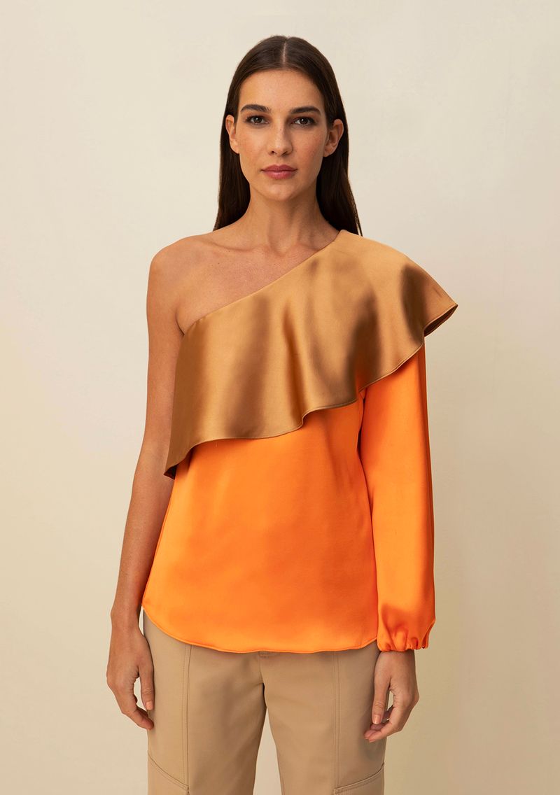OUTLETLinhasColeçõesRoupasBlusasBlusasBlusa Morena Rosa Ombro Só Manga Longa Babado Decote Laranja
