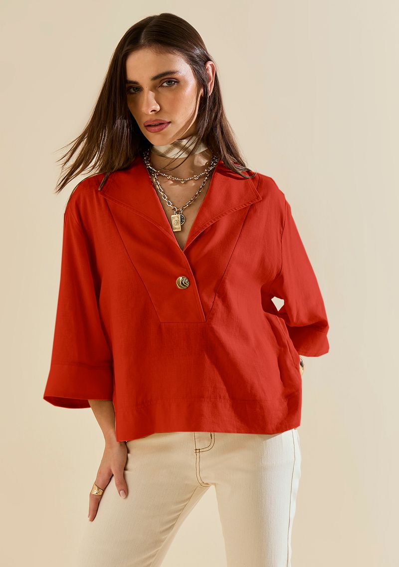 Blusa Morena Rosa Oversized Decote V Manga Curta Padrão Vermelho