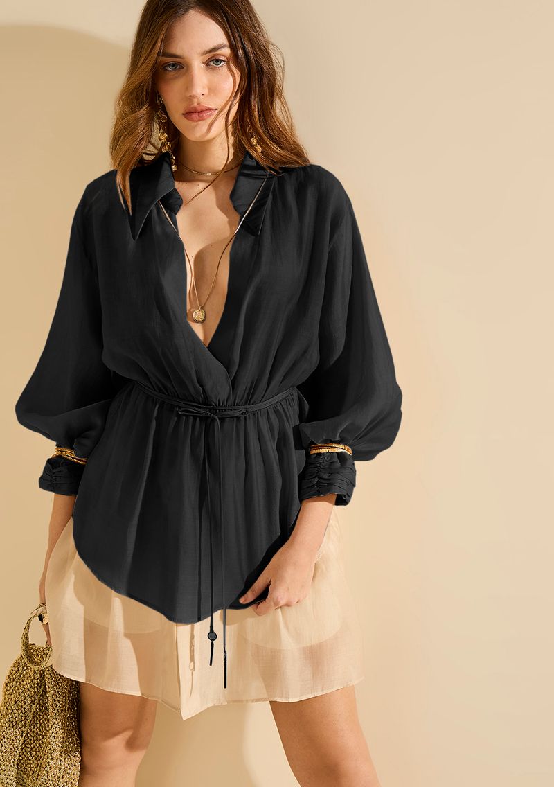 OUTLETLinhasColeçõesRoupasBlusasBlusasBlusa Morena Rosa Solta Decote Transpassado Manga 7 Oitavos Padrão Preto