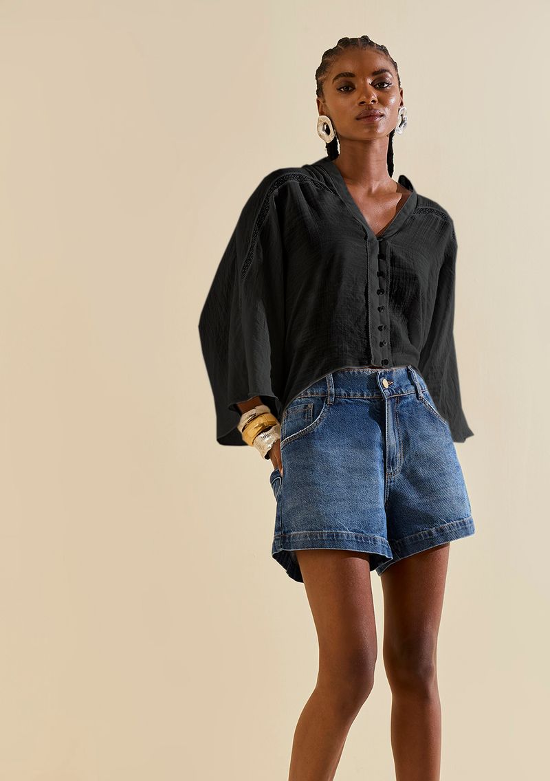 Blusa Morena Rosa Solta Decote V Manga 3 Quartos Padrão Preto
