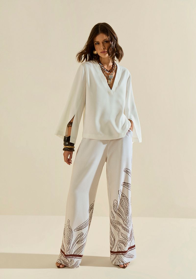 LinhasColeçõesRoupasBlusasBlusasBlusa Morena Rosa Solta Decote V Manga 7 Oitavos Padrão Off White