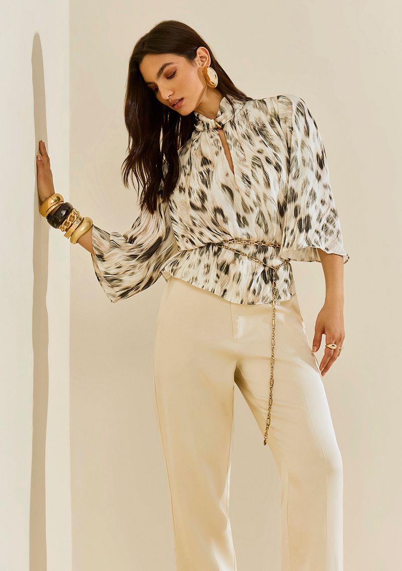LinhasColeçõesRoupasBlusasBlusasBlusa Morena Rosa Solta Gola Alta Manga 3 Quartos Padrão Off White
