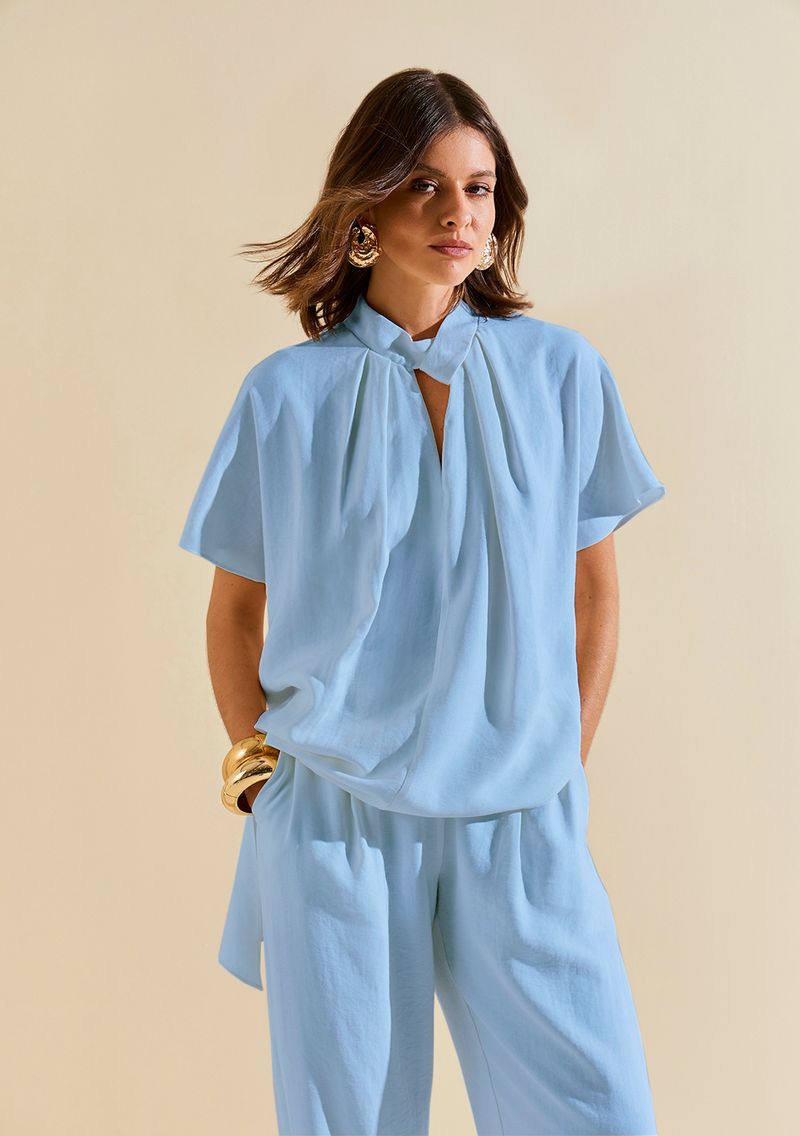 LinhasColeçõesRoupasBlusasBlusasBlusa Morena Rosa Solta Gola Alta Manga Curta Alongada Azul