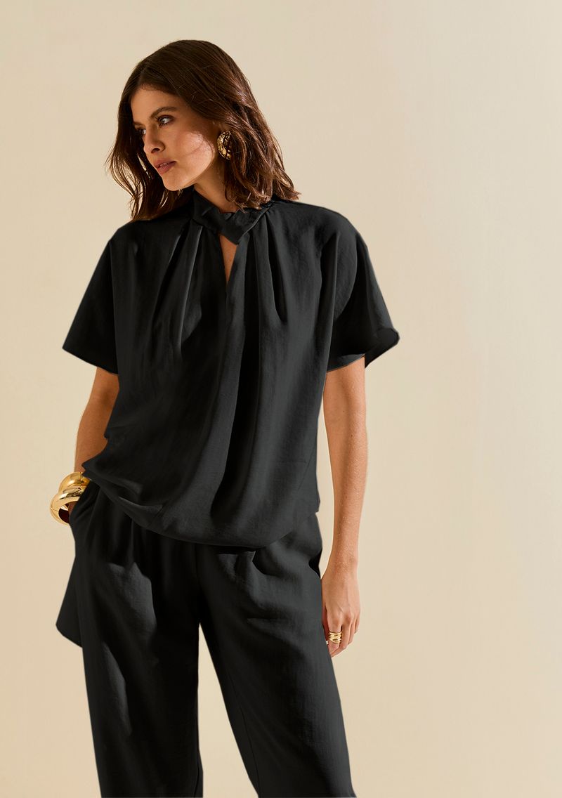 LinhasColeçõesRoupasBlusasBlusasBlusa Morena Rosa Solta Gola Alta Manga Curta Alongada Preto