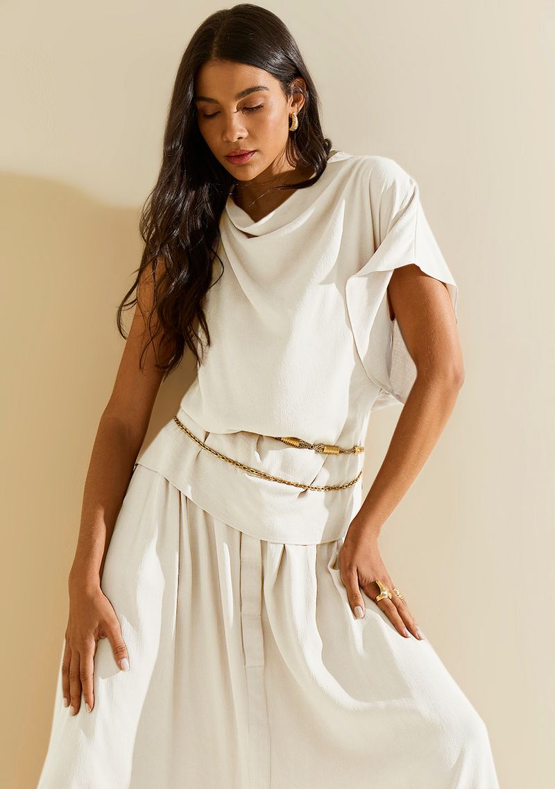 Blusa Morena Rosa Solta Gola Alta Manga Curta Padrão Off White