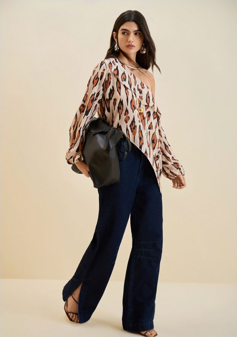 OUTLETLinhasColeçõesRoupasBlusasBlusasBlusa Morena Rosa Solta Um Ombro Só Manga Longa Padrão Bege