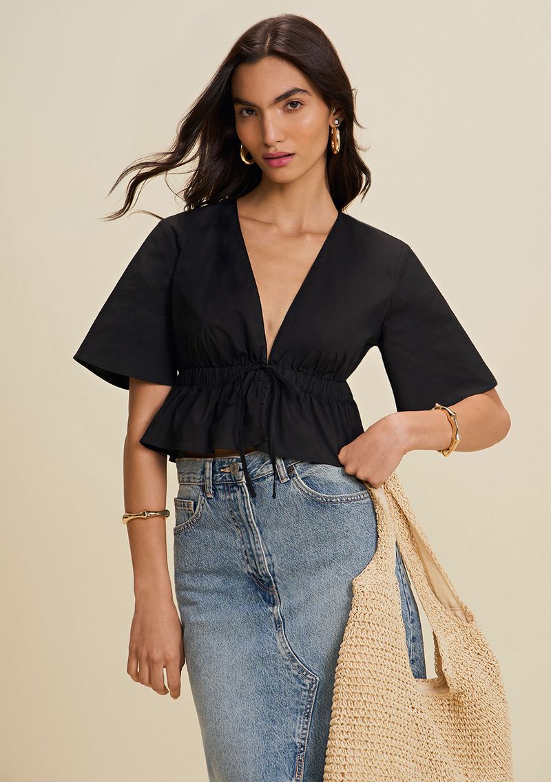 LinhasColeçõesRoupasBlusasBlusasBlusa Solta Decote V Manga Curta Cropped Preto