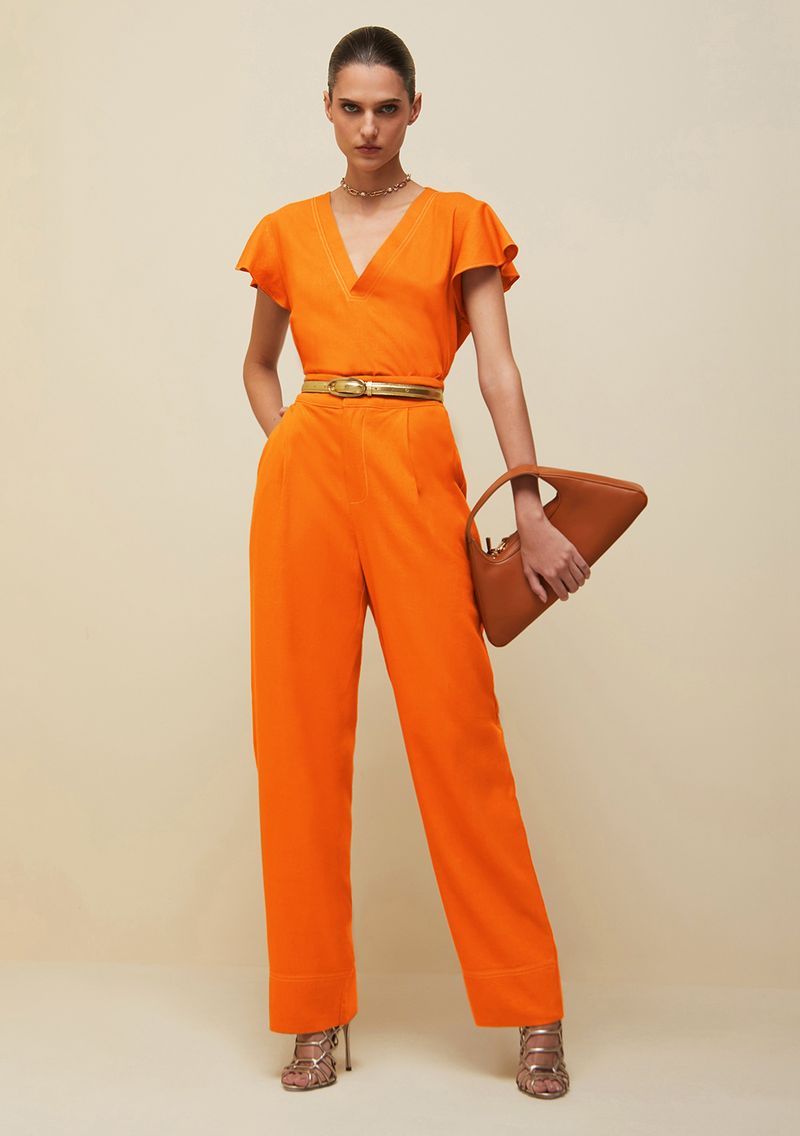 OUTLETLinhasColeçõesRoupasCalçasCalçasCalca Morena Rosa Alfaiataria Cós Alto Detalhe Barra Laranja