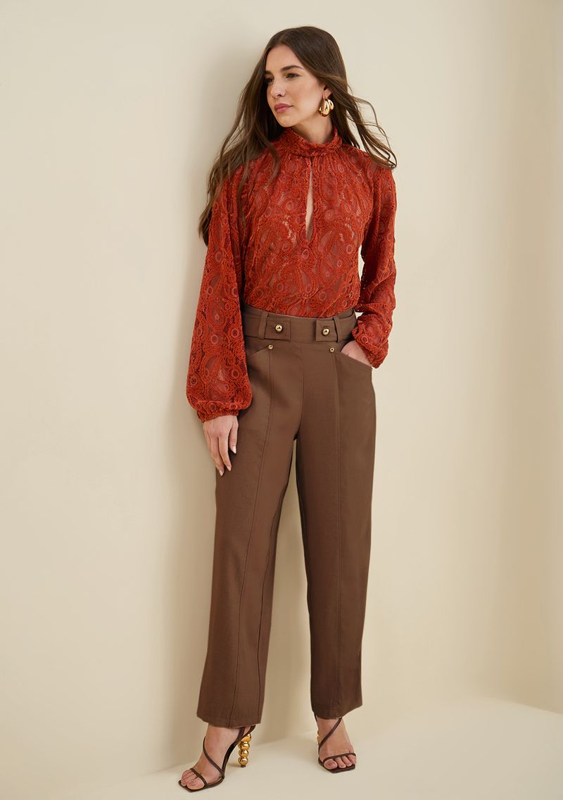Eleve seu estilo com a Calça Morena Rosa Cenoura Alta Marrom, perfeita para a mulher confiante que não abre mão da elegância. Com um corte skinny que valoriza a silhueta, essa peça é feita de viscose, oferecendo conforto e sofisticação. Ideal para o outono/inverno, sua versatilidade permite combinações com blusas leves ou camisetas descontraídas, e acessórios dourados para um toque extra de glamour. Parte da coleção 'Ela é Carioca!', reflete a energia vibrante e despojada do Rio de Janeiro. Deixe-se envolver pela essência brasileira e transforme cada dia em um desfile de moda pessoal. Acessórios não acompanham as peças.