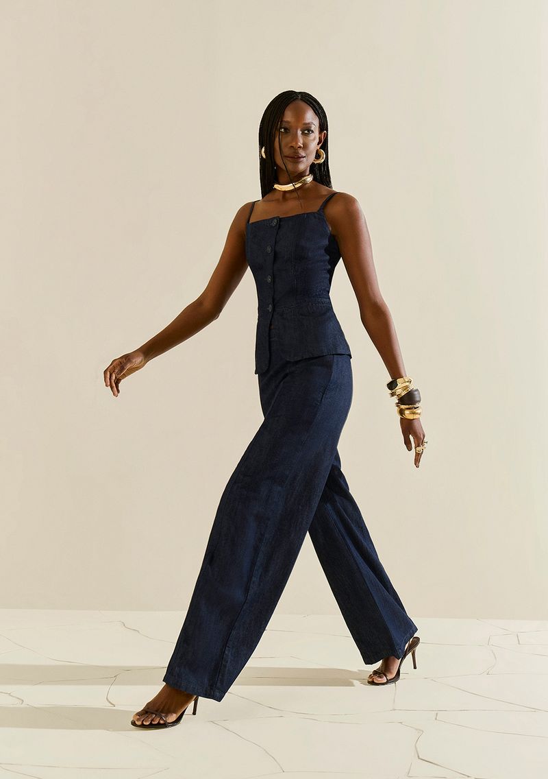 LinhasColeçõesRoupasCalçasCalçasCalça Morena Rosa Pantalona Alta Azul