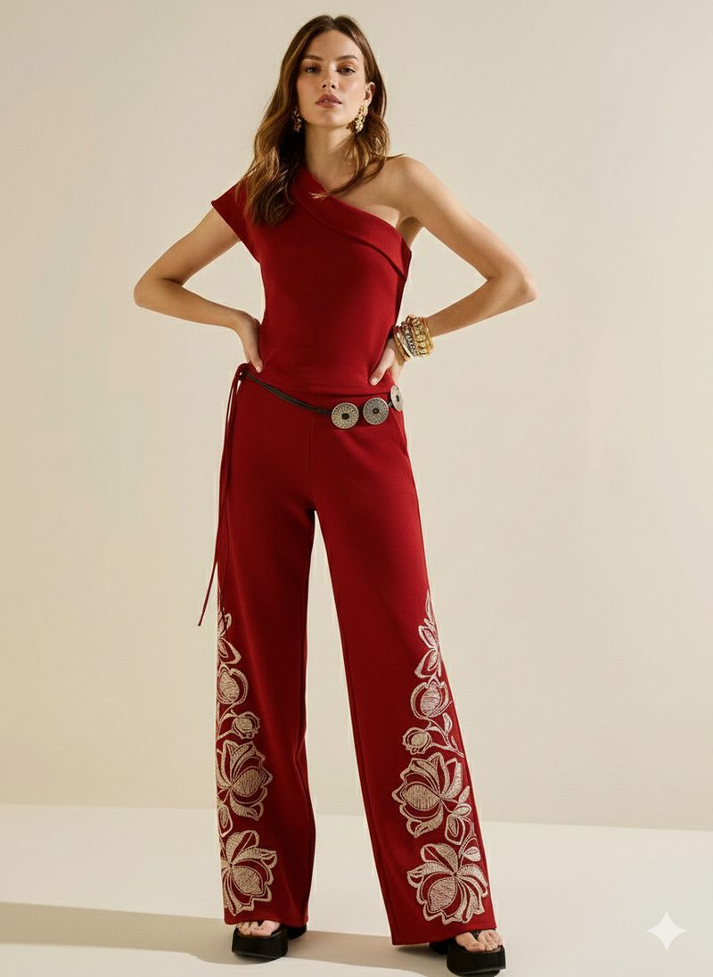 OUTLETLinhasColeçõesRoupasCalçasCalçasCalça Morena Rosa Pantalona Alta Vermelho