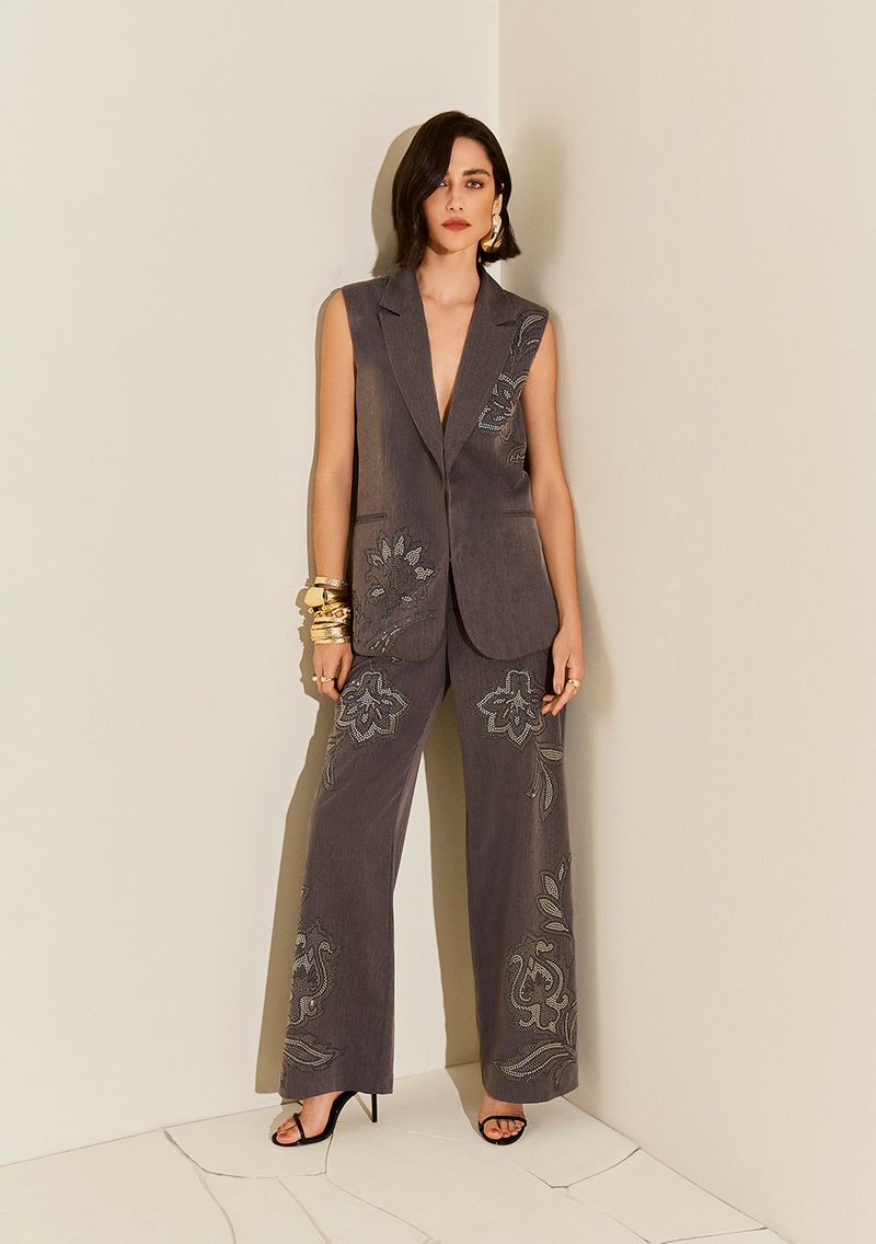 LinhasColeçõesRoupasCalçasCalçasCalça Morena Rosa Reta Alta Cinza