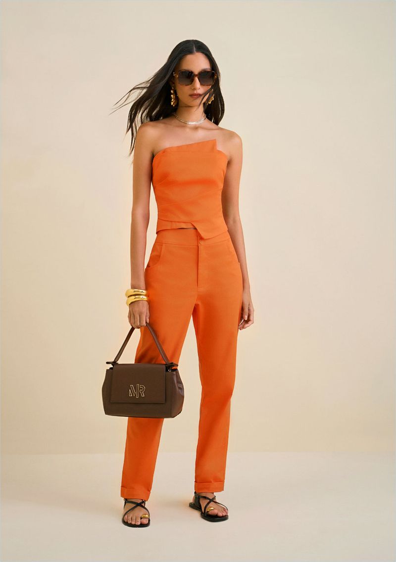 OUTLETLinhasColeçõesRoupasCalçasCalçasCalça Morena Rosa Reta Cós Alto Alfaiataria Laranja