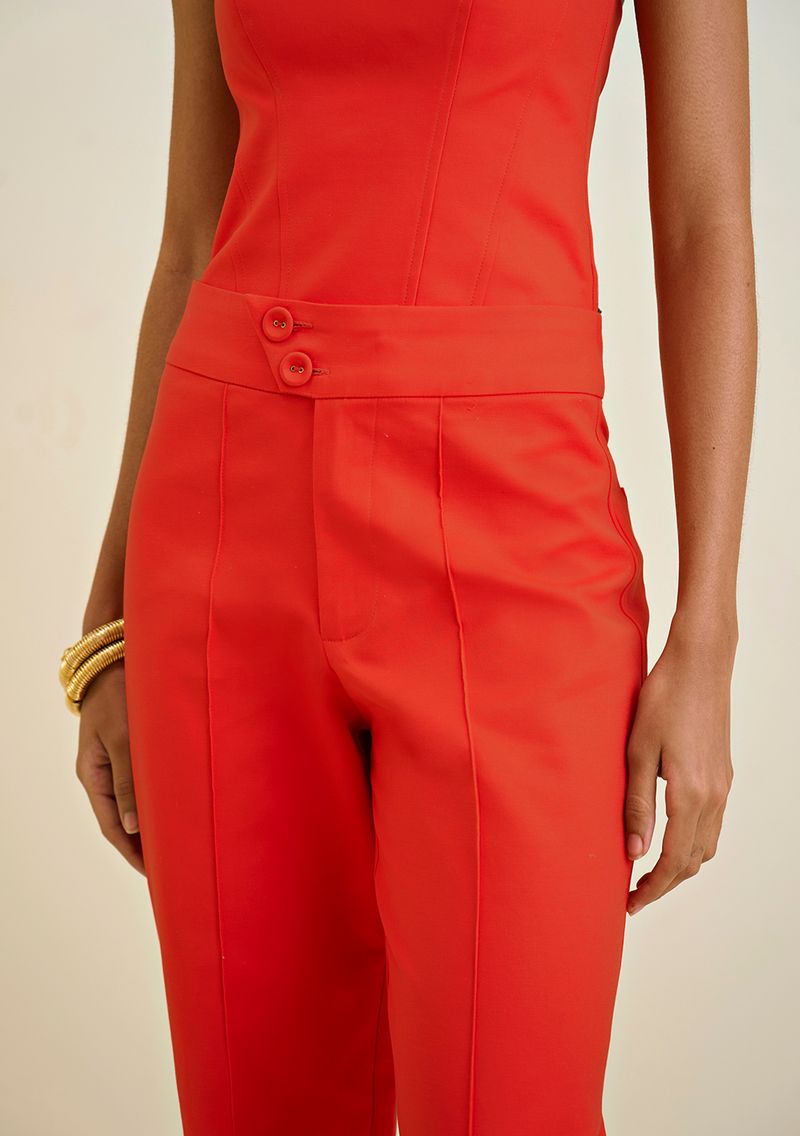 OUTLETLinhasColeçõesRoupasCalçasCalçasCalça Morena Rosa Reta Cós Alto Detalhe Cós Vermelho