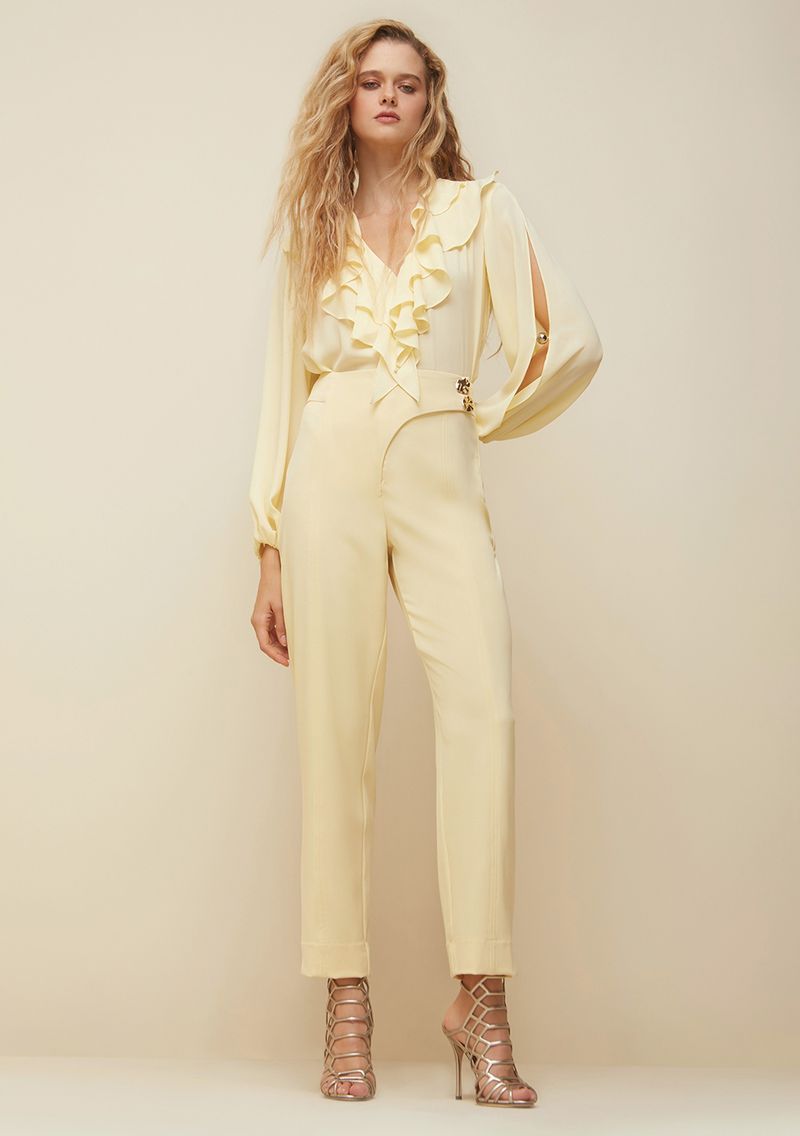 OUTLETLinhasColeçõesRoupasCalçasCalçasCalca Morena Rosa Reta Cós Transpassado Com Botão Amarelo