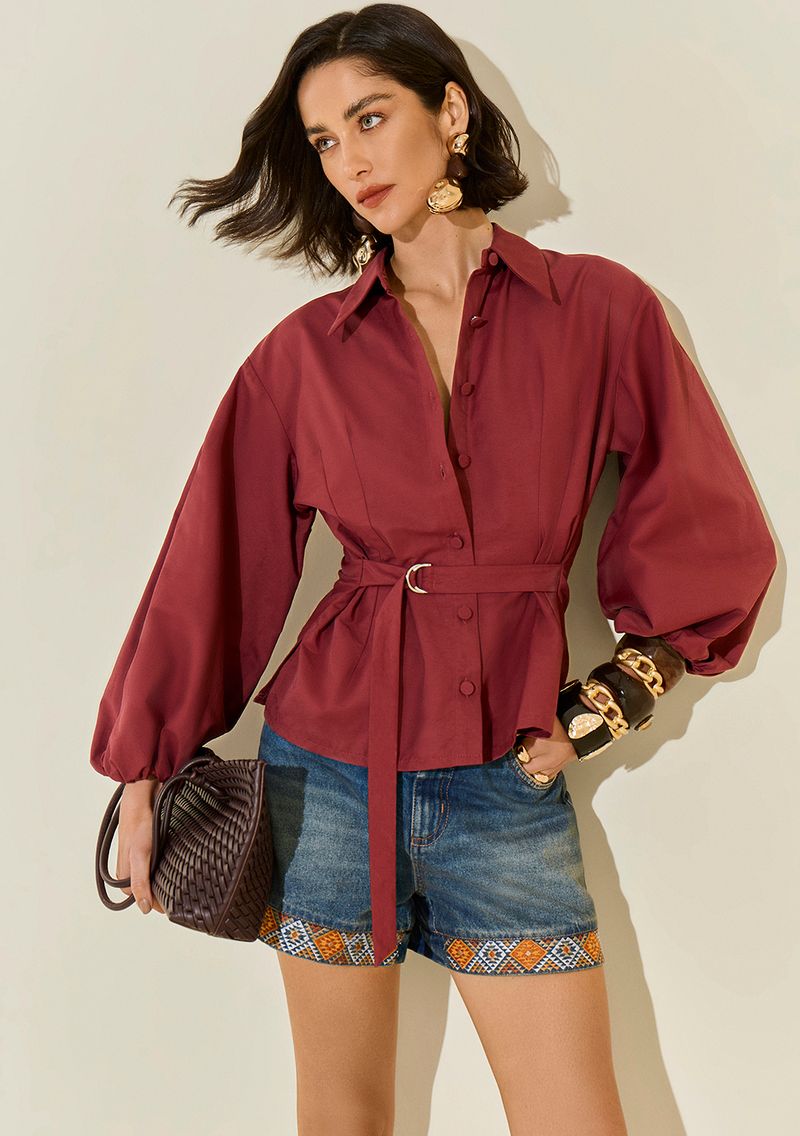 Camisa Morena Rosa Ajustada Gola Clássica Manga Longa Padrão Bordo