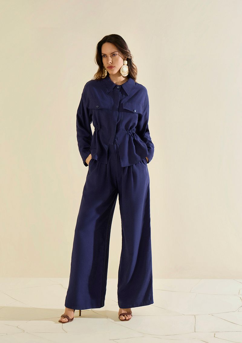 Camisa Morena Rosa Oversized Gola Clássica Manga Longa Padrão Azul