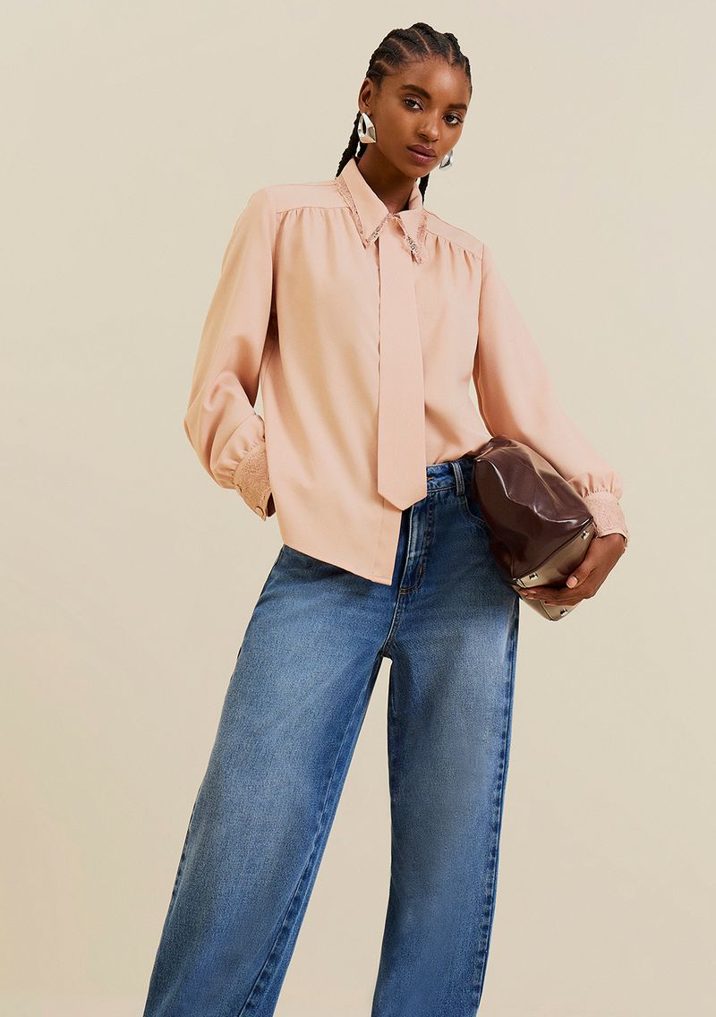 Camisa Morena Rosa Solta Gola Clássica Manga Longa Alongada Bege