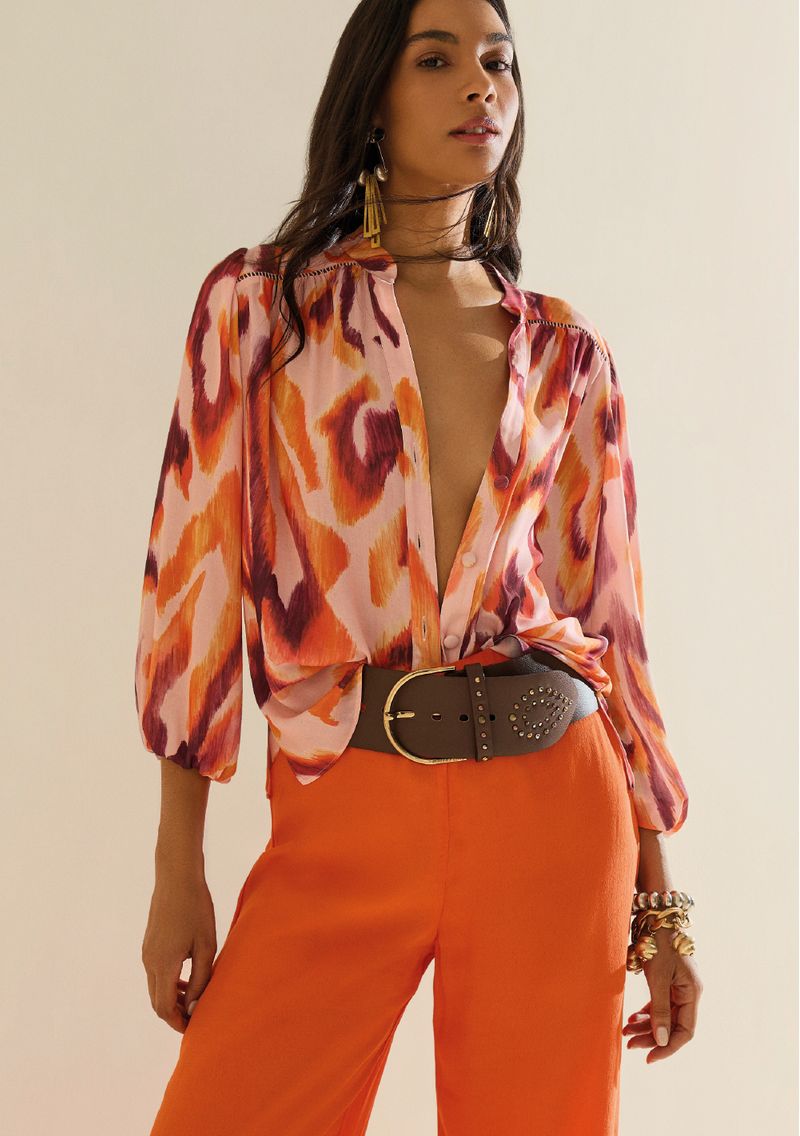 Camisa Morena Rosa Solta Gola Padre Manga 7 Oitavos Padrão Rosa