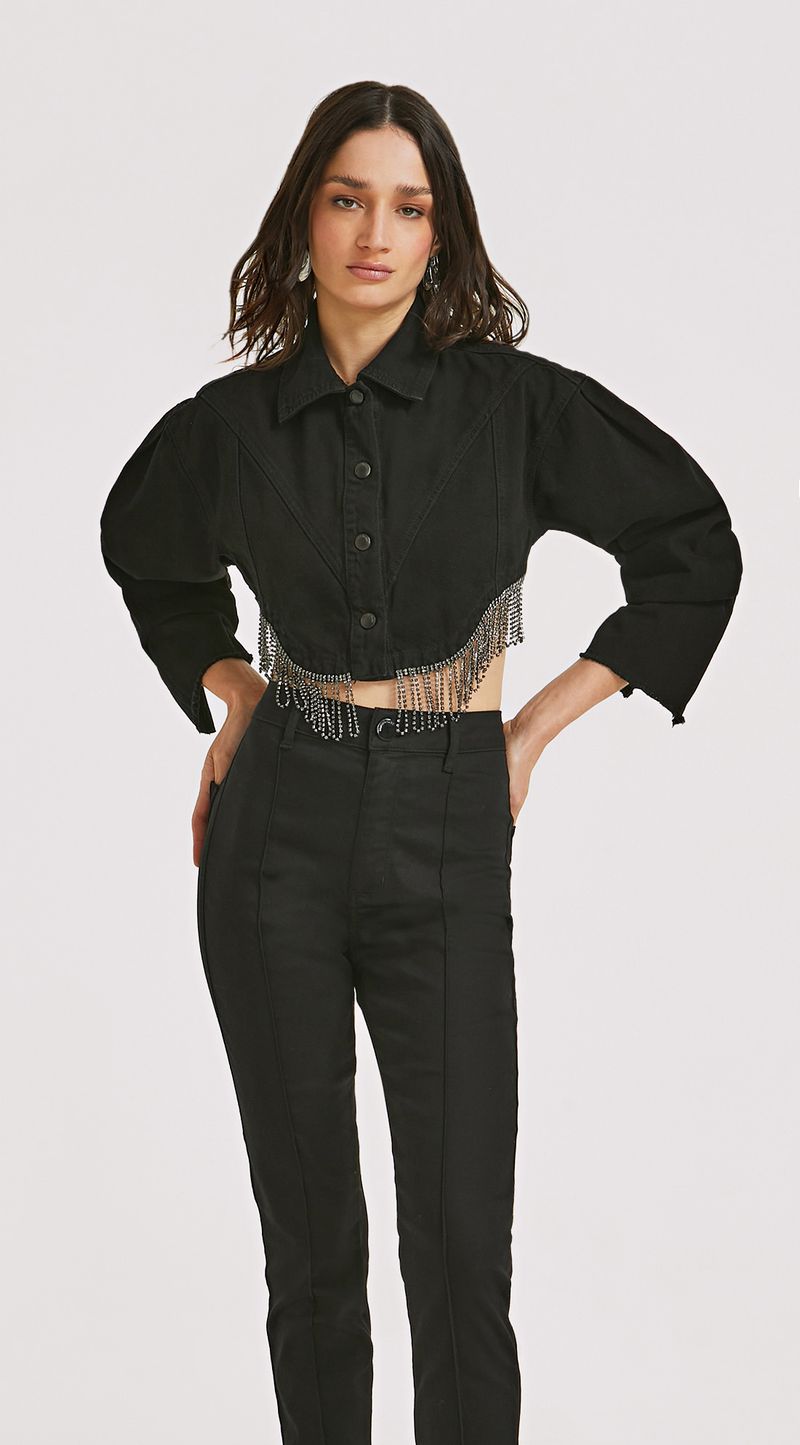 Jaqueta Morena Rosa Cropped Detalhe Franjas Preto