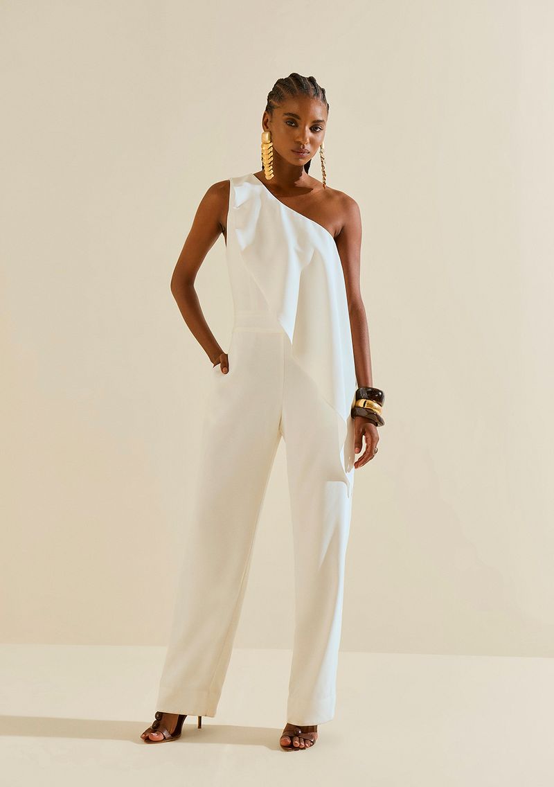Macacão Morena Rosa Ajustado Um Ombro Só Sem Manga Longo Off White
