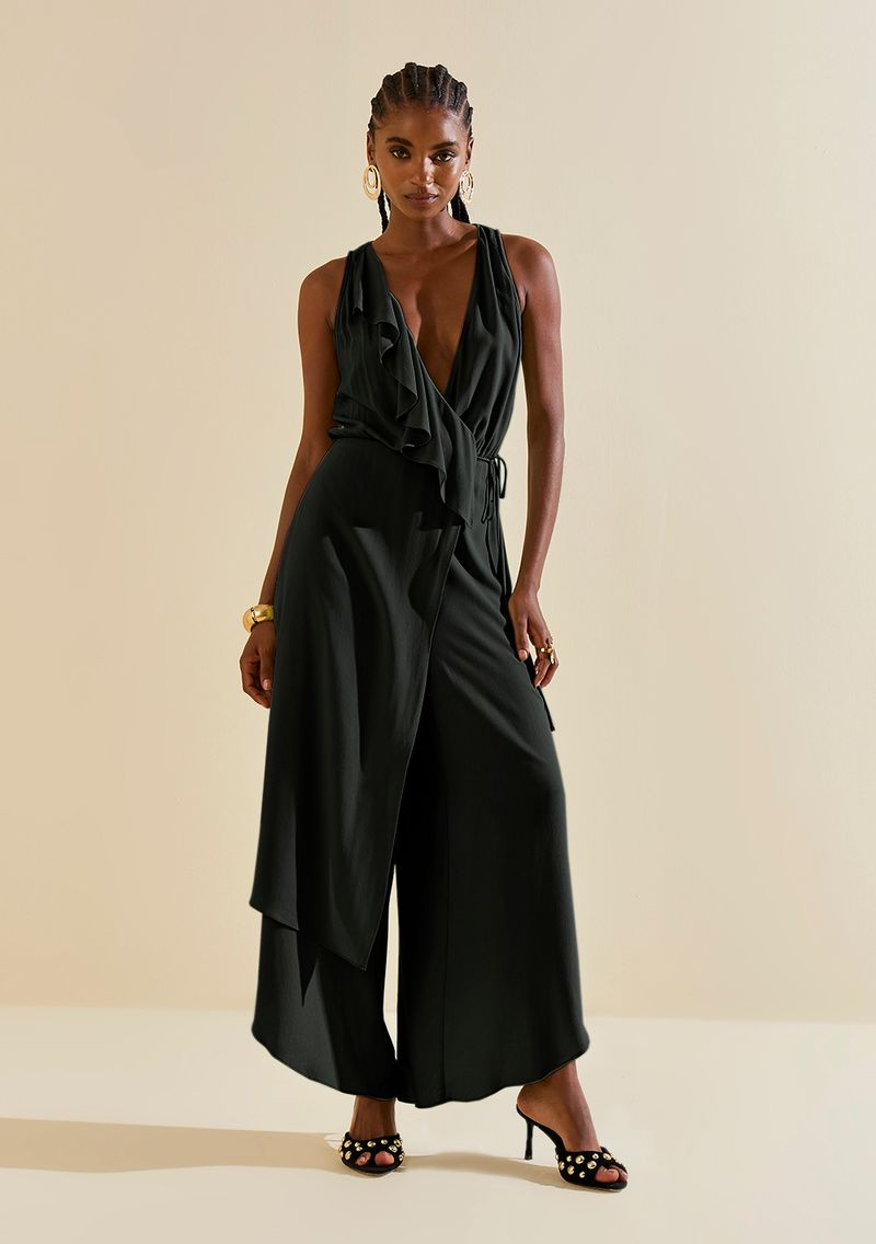 LinhasColeçõesRoupasMacacõesMacacõesMacacão Morena Rosa Solto Decote V Sem Manga Midi Preto