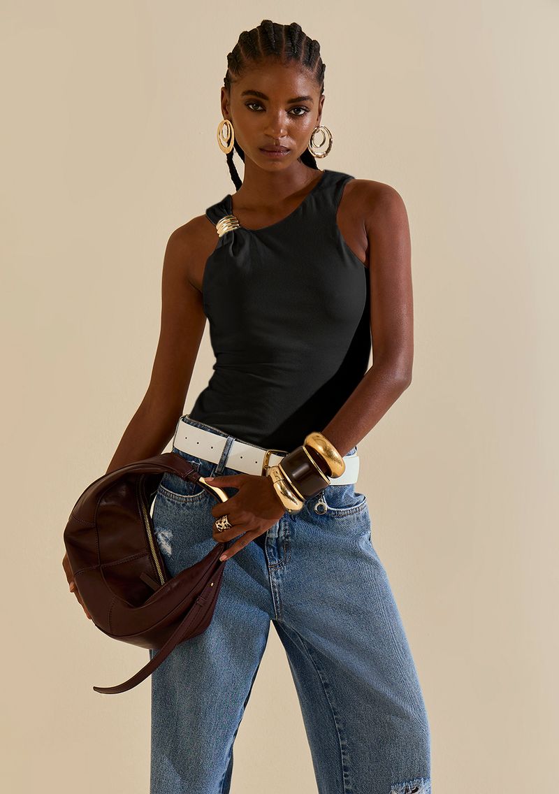 Regata Morena Rosa Ajustada Decote Careca Padrão Preto