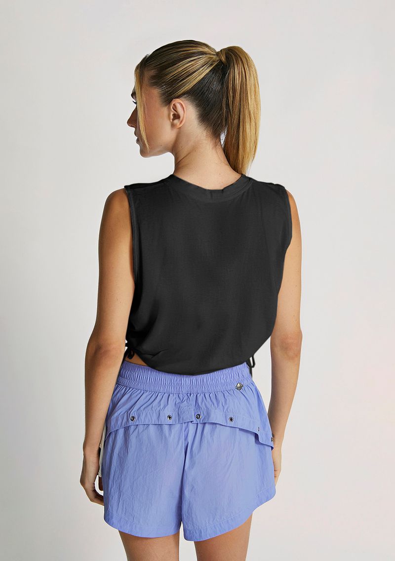OUTLETLinhasFitnessBlusasRegata Morena Rosa Decote Redondo Amarração Lateral Preto