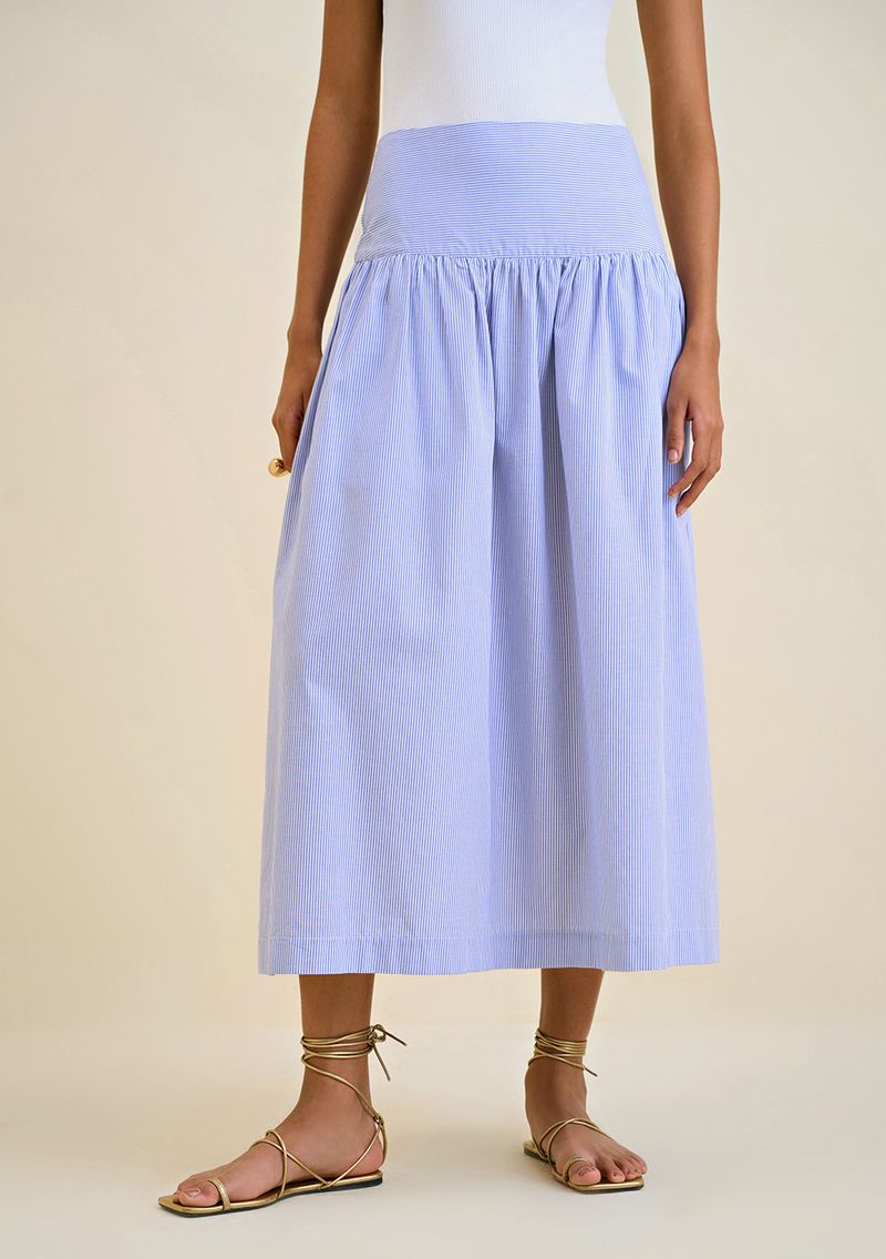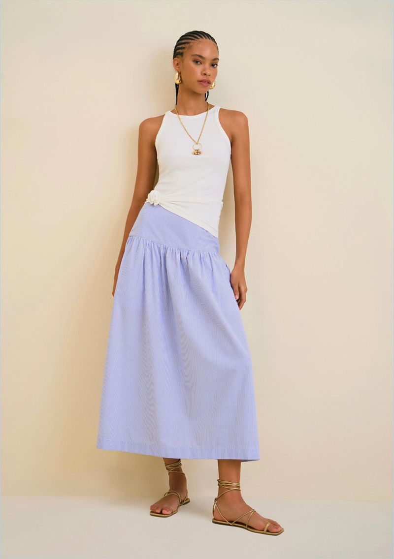 OUTLETLinhasColeçõesJeansRoupasSaiasSaiasSaiasSaia Morena Rosa Evasê Alta Midi Azul
