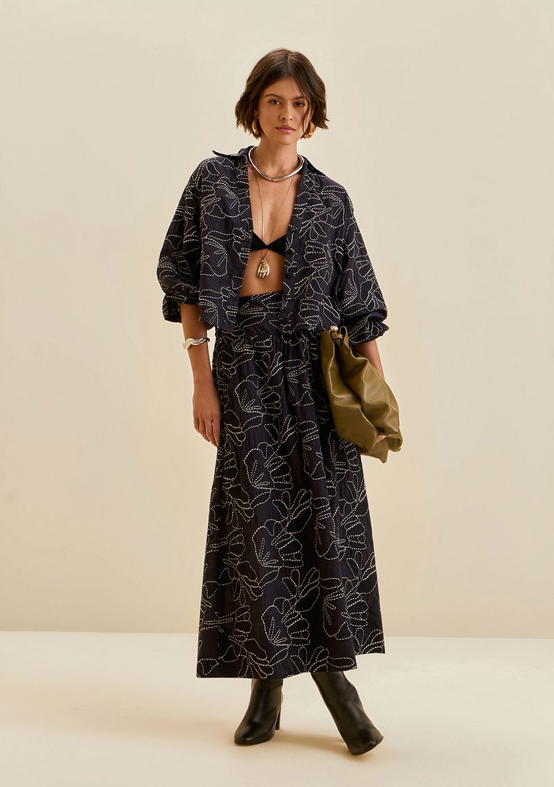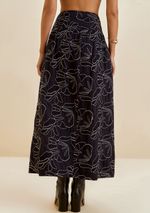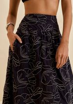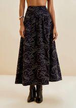Saia Morena Rosa Evasê Alta Midi Azul Escuro