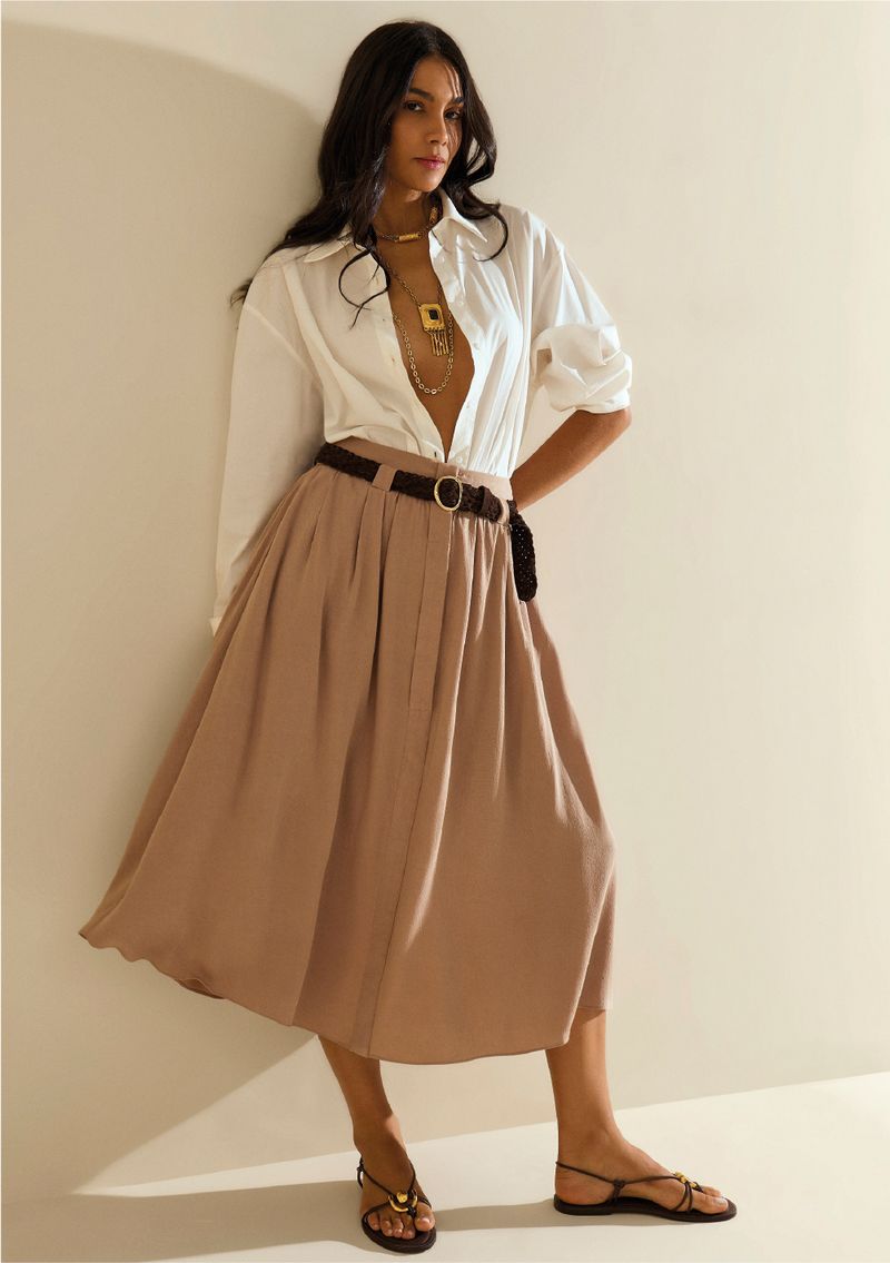 Saia Morena Rosa Evasê Alta Midi Marrom: um toque de sofisticação e versatilidade que a acompanha do trabalho à festa. Com um corte evasê que valoriza a silhueta e comprimento midi, ela une elegância e conforto em uma só peça. Feita em liocel e viscose, é perfeita para os dias quentes de verão, trazendo fluidez e leveza ao seu visual. A tonalidade marrom é um curinga para criar looks incríveis, combinando perfeitamente com blusas em tons vibrantes ou neutros. Finalize com sandálias elegantes ou tênis casuais para um look moderno e autêntico. Parte da Coleção Recife, essa saia traduz a brasilidade e celebra a mulher confiante e cheia de estilo. Invista e transforme cada momento em uma experiência inesquecível. *Os acessórios não acompanham a peça*
