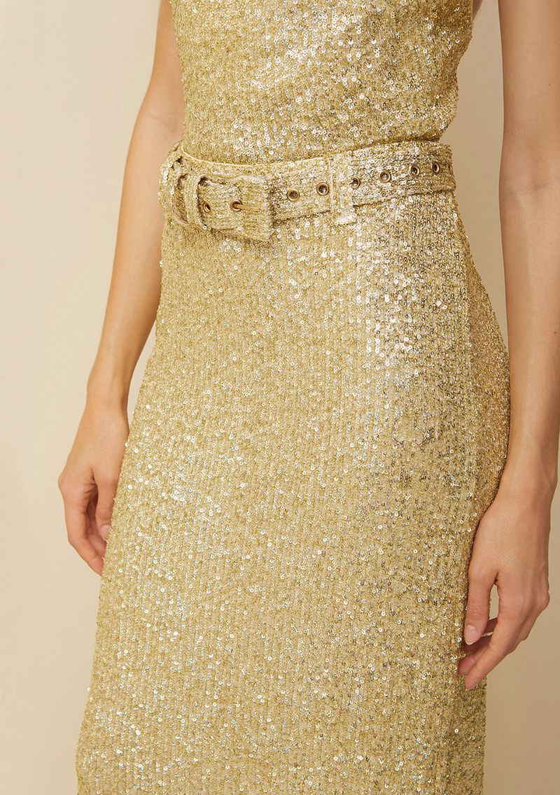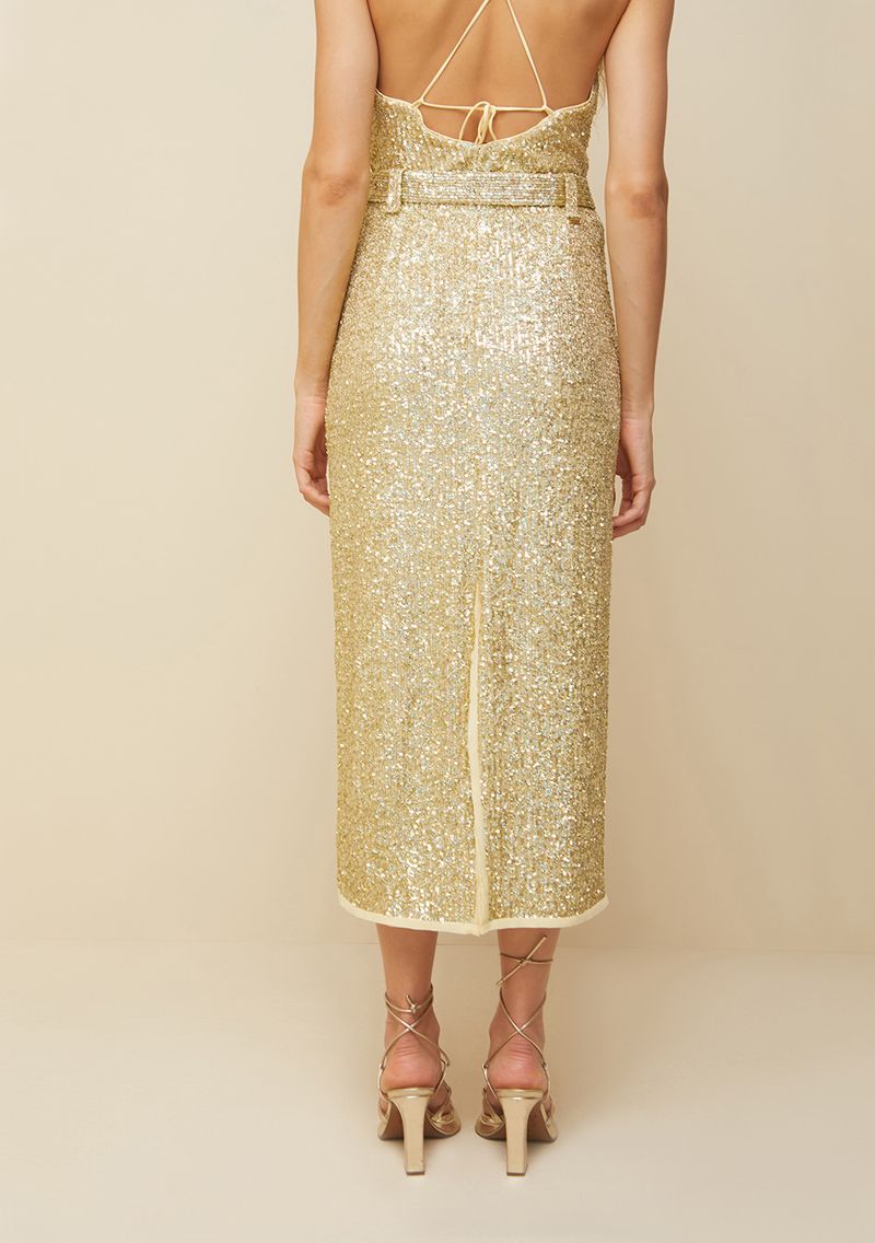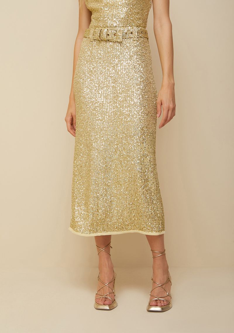 Saia Morena Rosa Midi Reta Com Cinto Dourado