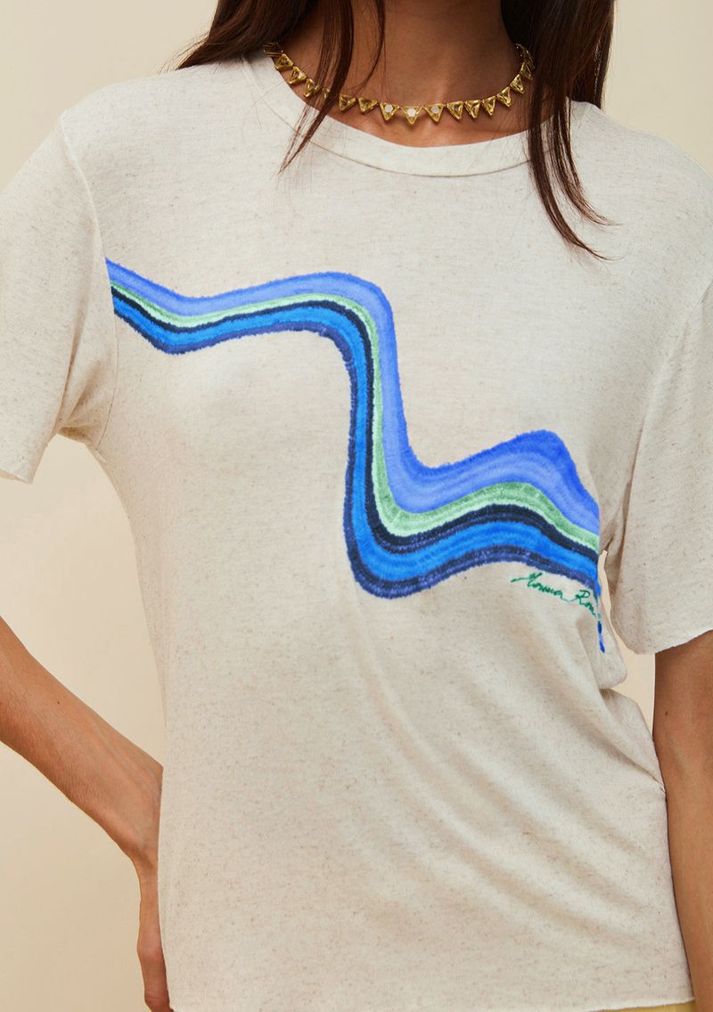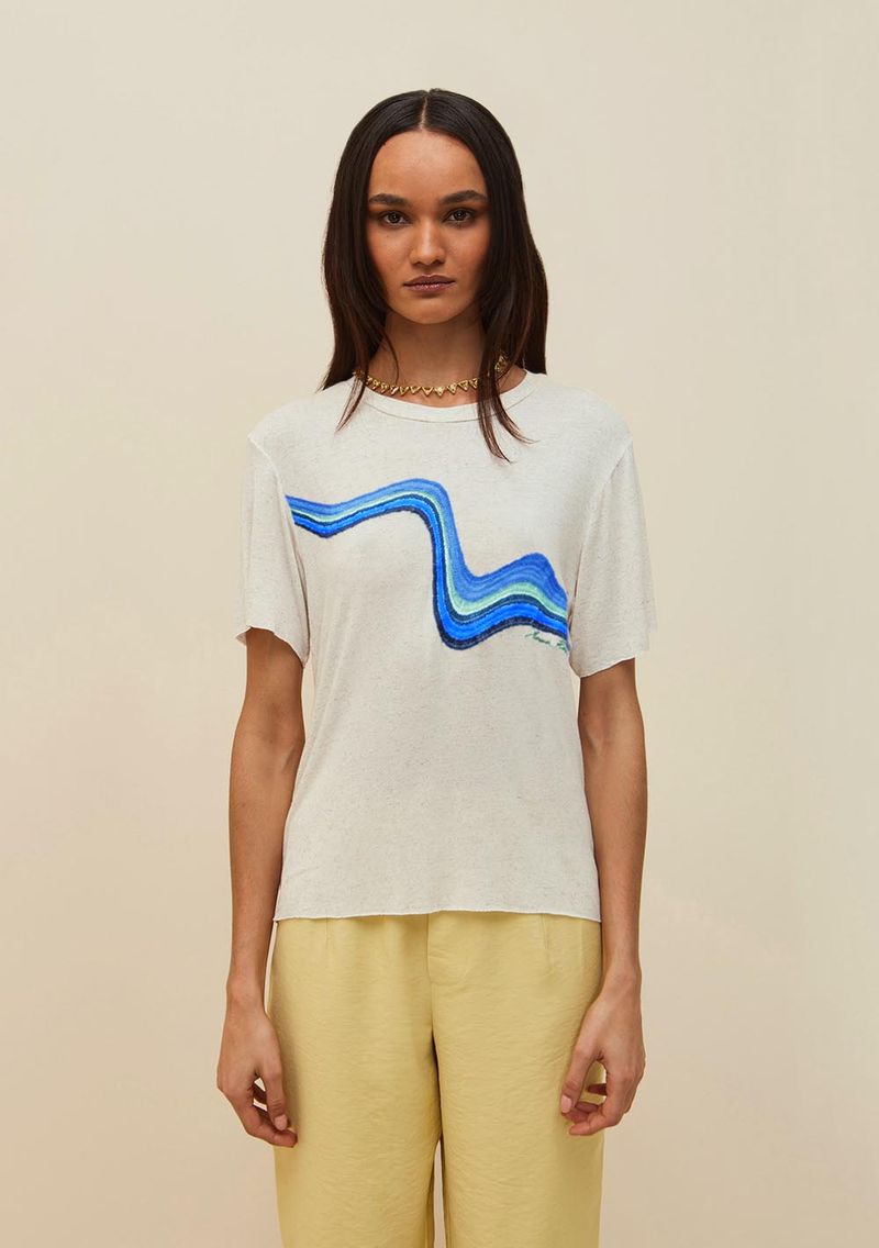 T-Shirt Morena Rosa Decote Redondo Bordado Industrial Azul