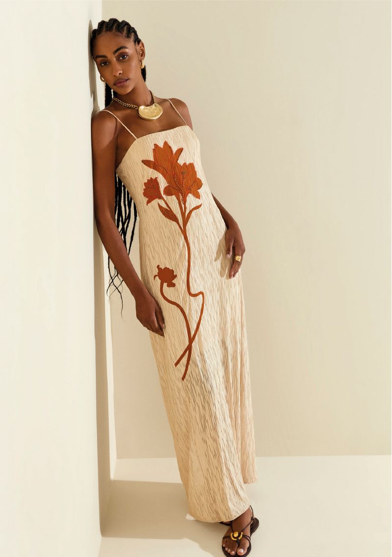 LinhasColeçõesRoupasVestidosVestidosVestido Morena Rosa Ajustado Decote Reto Com Alça Longo Bege