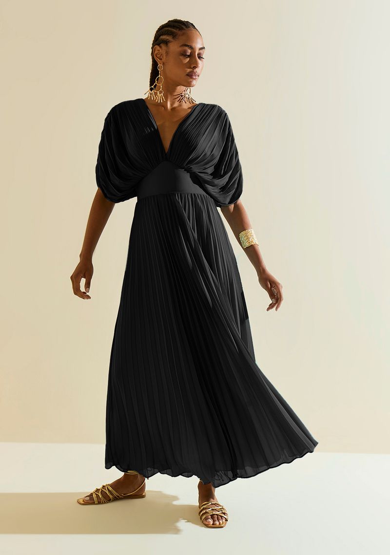 Vestido Morena Rosa Ajustado Decote V Manga Curta Longo Preto