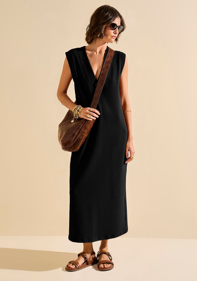 Vestido Morena Rosa Ajustado Decote V Sem Manga Midi Preto