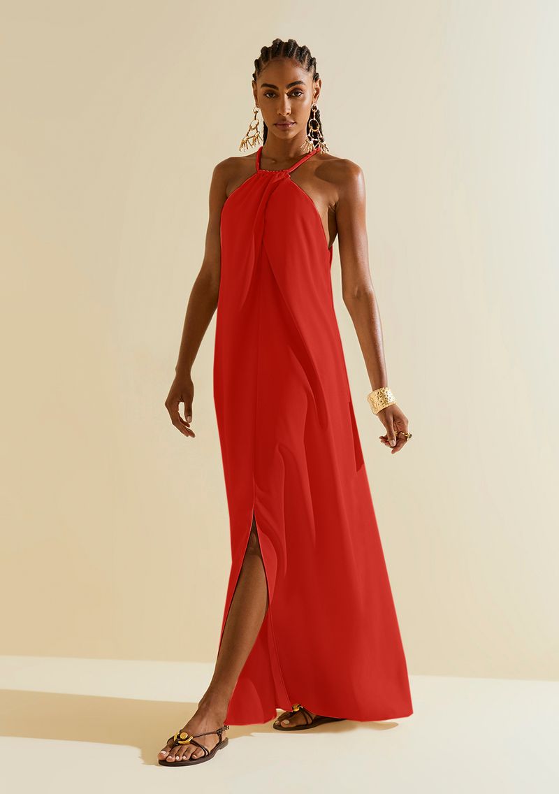 LinhasColeçõesRoupasVestidosVestidosVestido Morena Rosa Ajustado Decote V Sem Manga Midi Vermelho