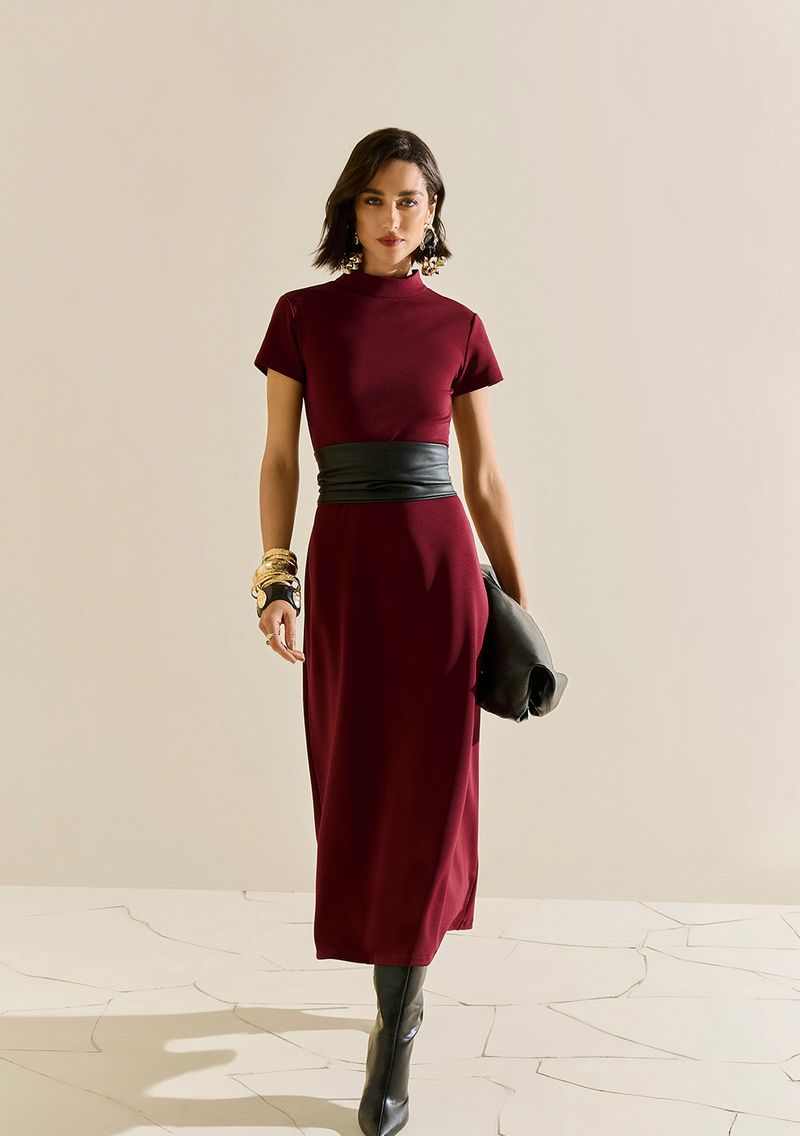 Vestido Morena Rosa Ajustado Gola Alta Manga Curta Midi Bordo
